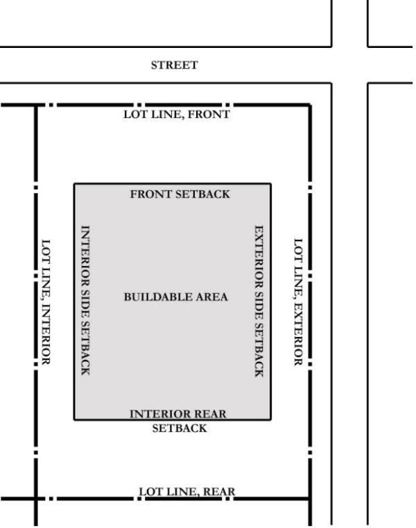 Setback Line, Interior Rear: A line parallel to and at a distance from the interior rear lot line that establishes the minimum distance between said lot line and a structure on a lot (see figure in definition of setback line, exterior).