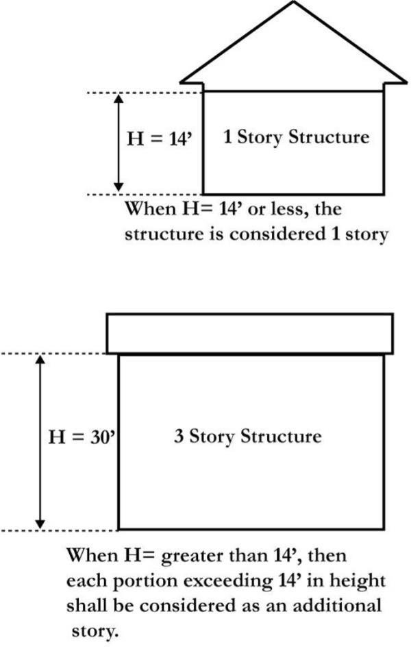 Story: That portion of a building included between the surface of any floor and the surface of the floor next above it, or if there be no floor above it, then the space between the floor and the ceiling next above it. Any portion of a story exceeding fourteen (14) feet in height shall be considered as an additional story for each fourteen (14) feet or fraction thereof.