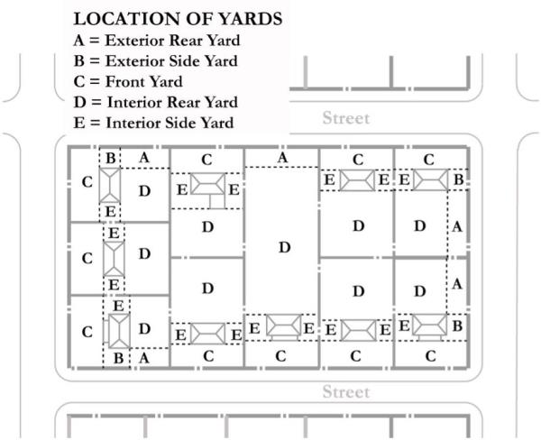 Yard, Exterior: A front, exterior side or exterior rear yard. (see figure in definition of yard)