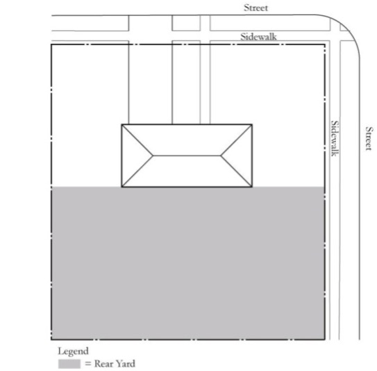 Yard, Exterior Rear: Portions of a rear yard that are adjacent to a public street right-of-way. (see figure in definition of yard)