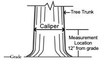 Caliper: The diameter of a tree trunk. For purposes of the Aurora Zoning Ordinance, the caliper of a tree drunk is measured 12” from ground level or grade.