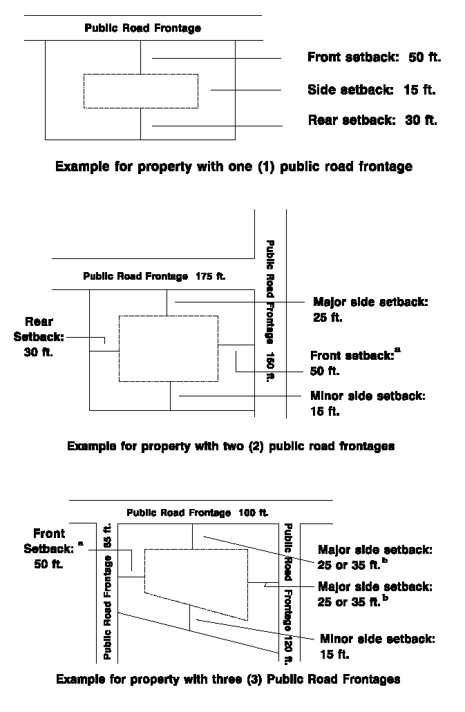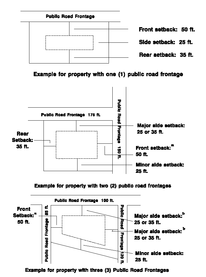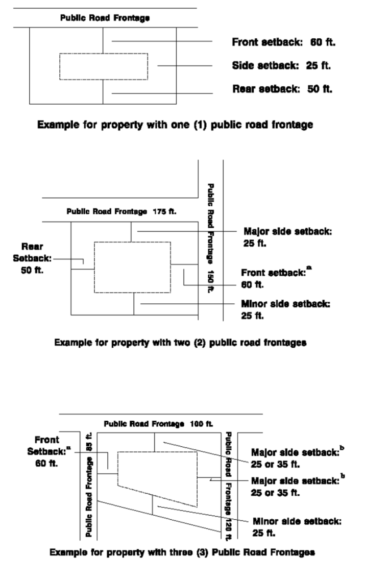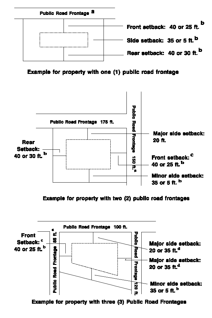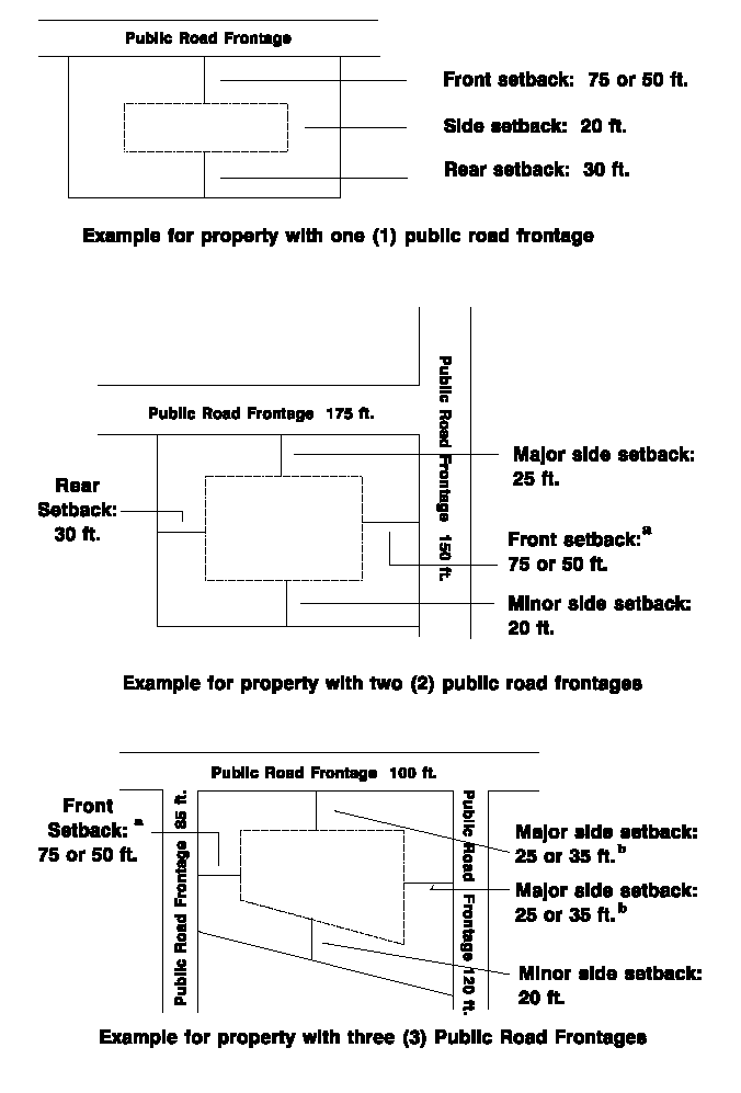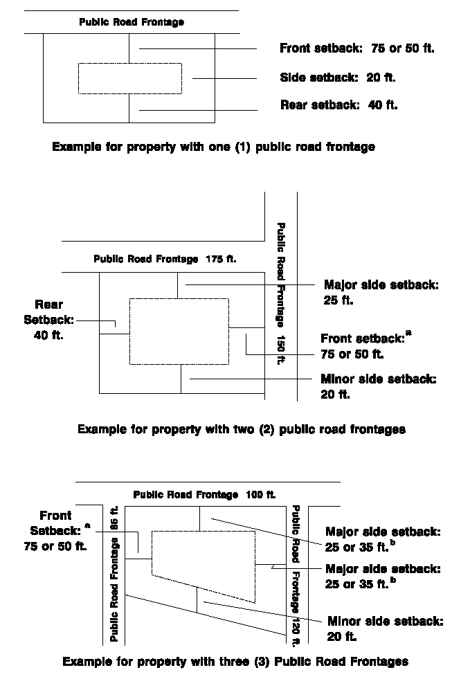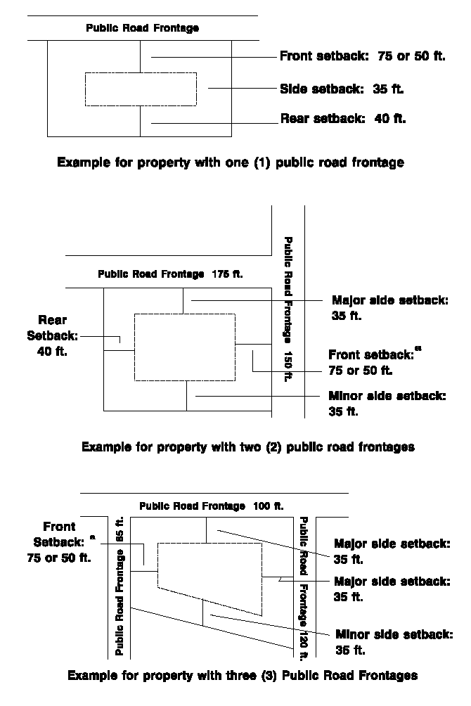 Minimum public road frontage: 75 feet; cul-de-sac, 50 feet.
