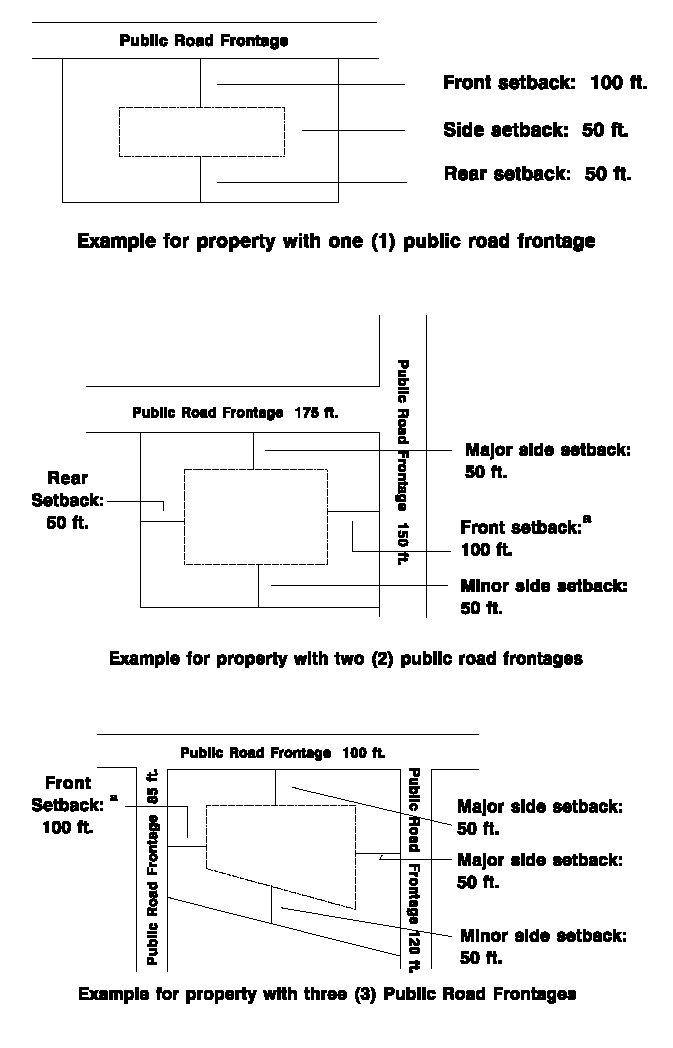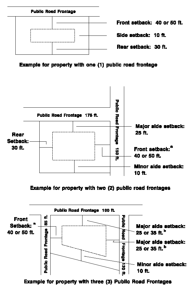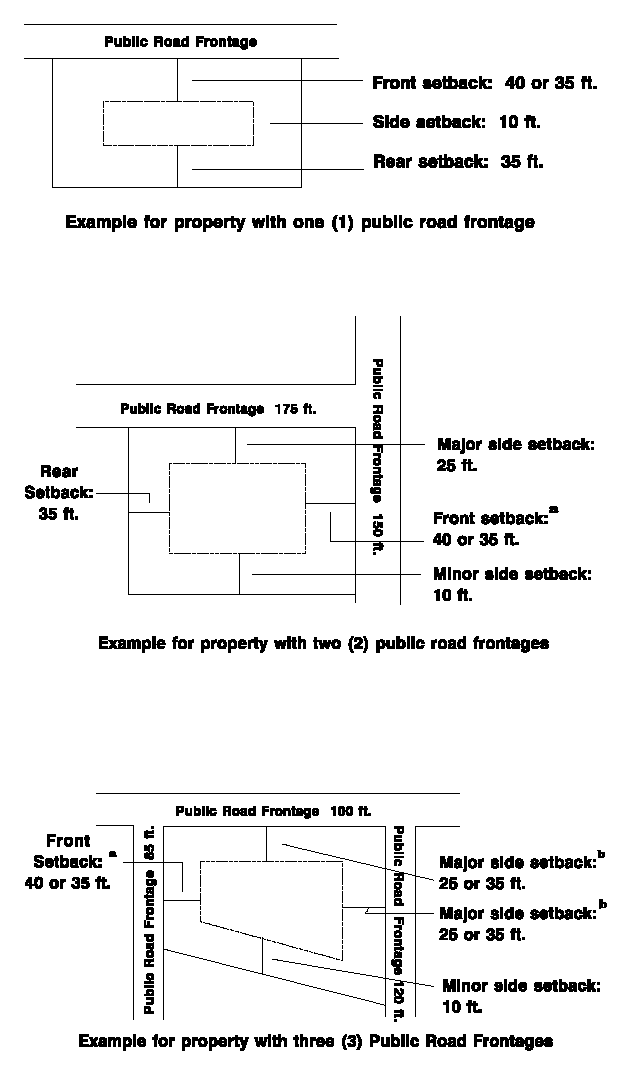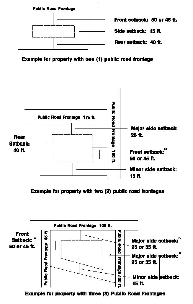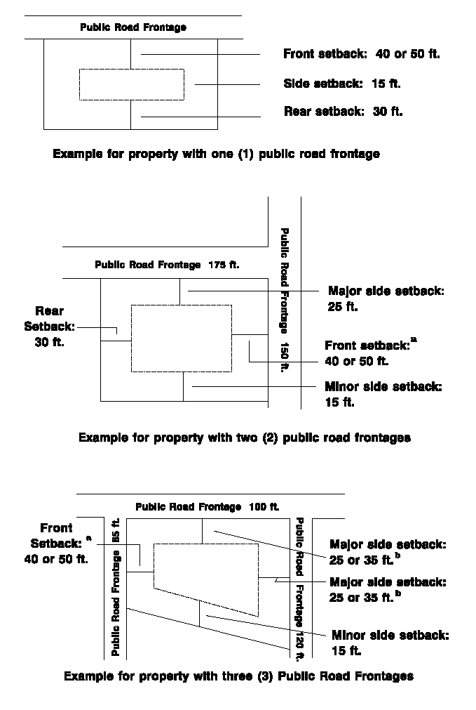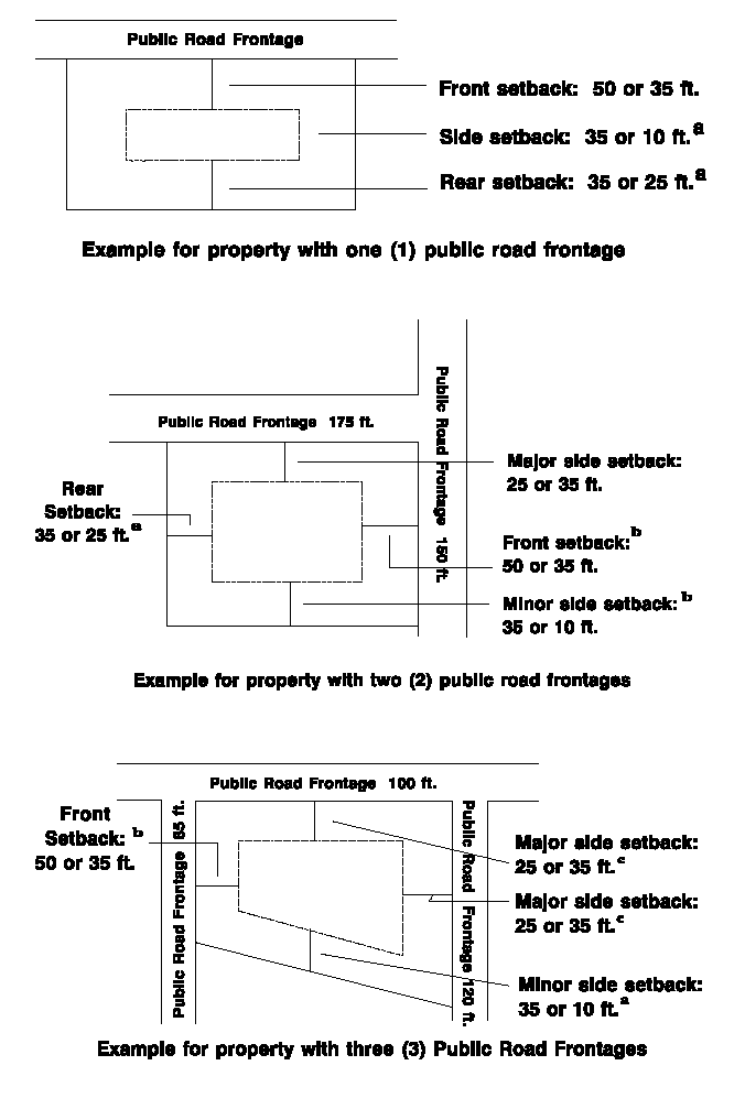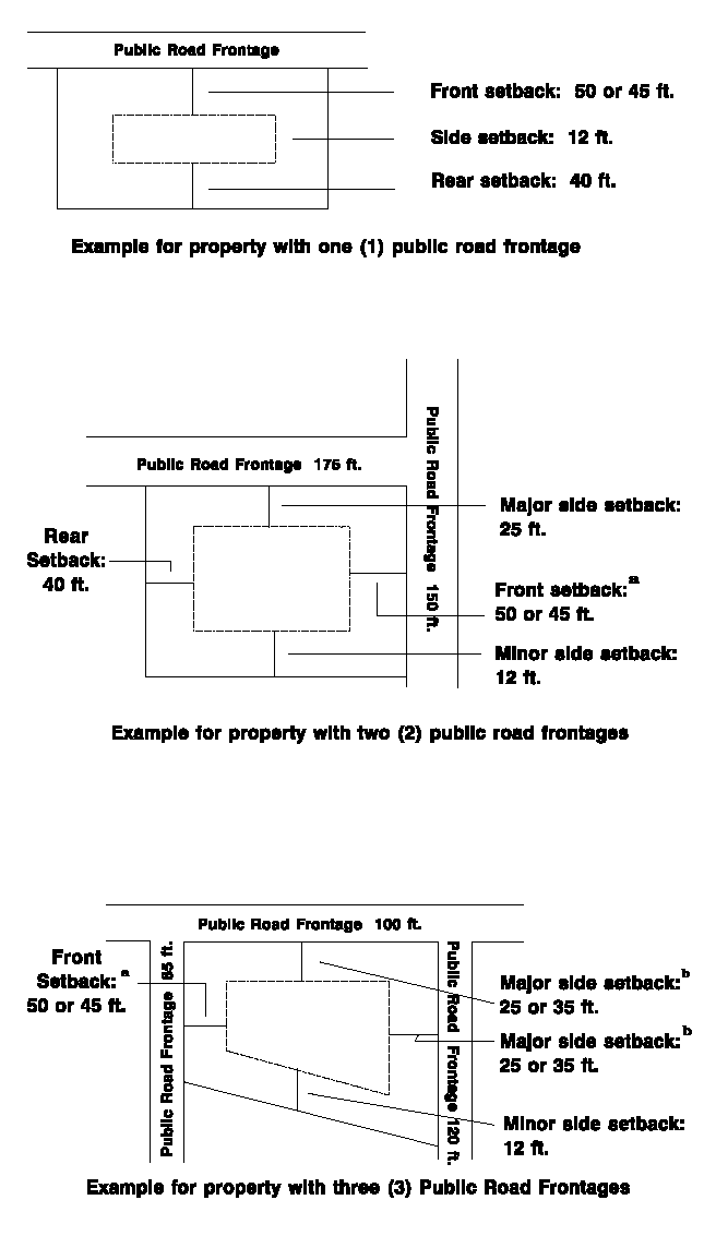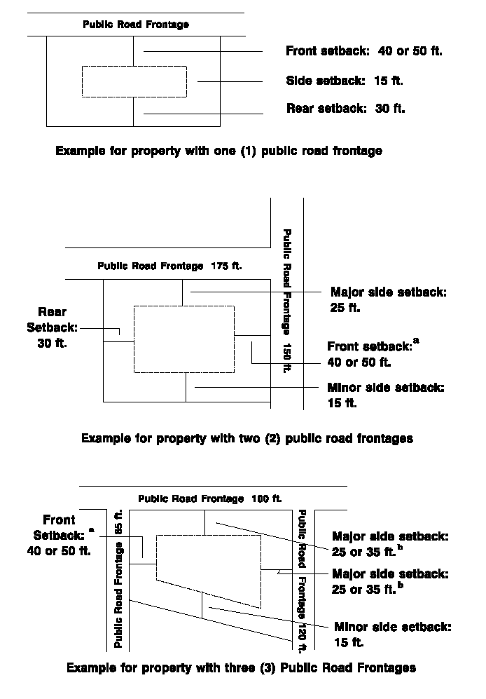 Minimum public road frontage: 75 feet; cul-de-sac, 50 feet.
