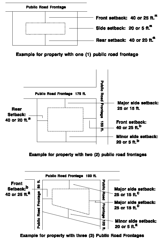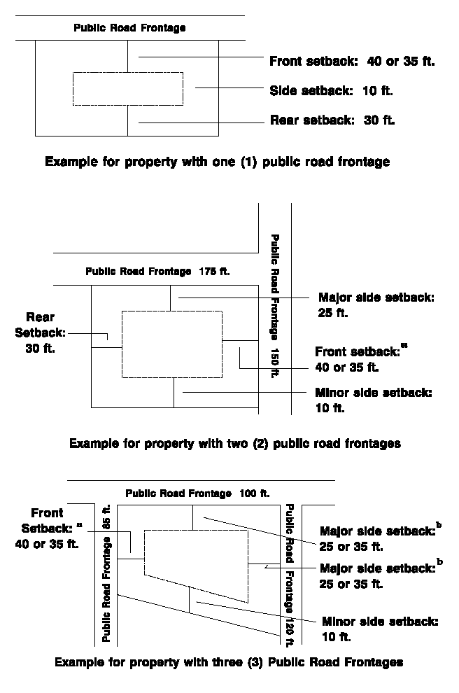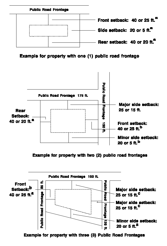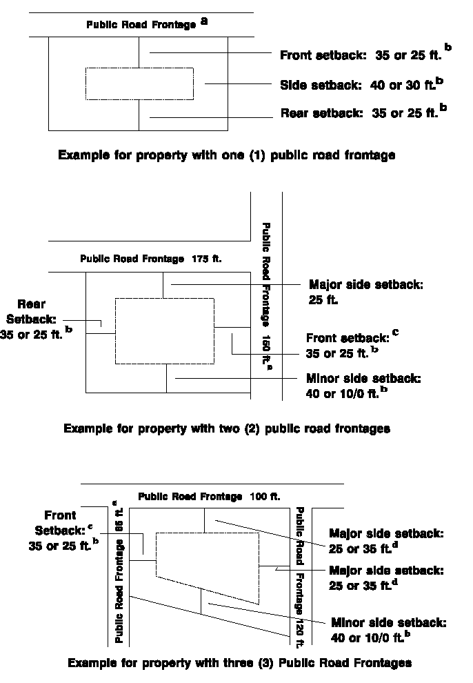 Property with shorter amount of road frontage will be the front setback for determining other setbacks (major side, side, rear).