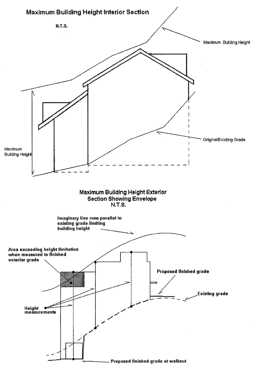 Building height means the distance measured vertically from the existing grade or finished grade (whichever is more restrictive) at any given point outside the building to the top of a flat roof, mansard roof or sloping roof. Within a building, height shall be measured vertically from any point on a flat roof, mansard roof or sloping roof to the existing grade or finished grade directly below said point.