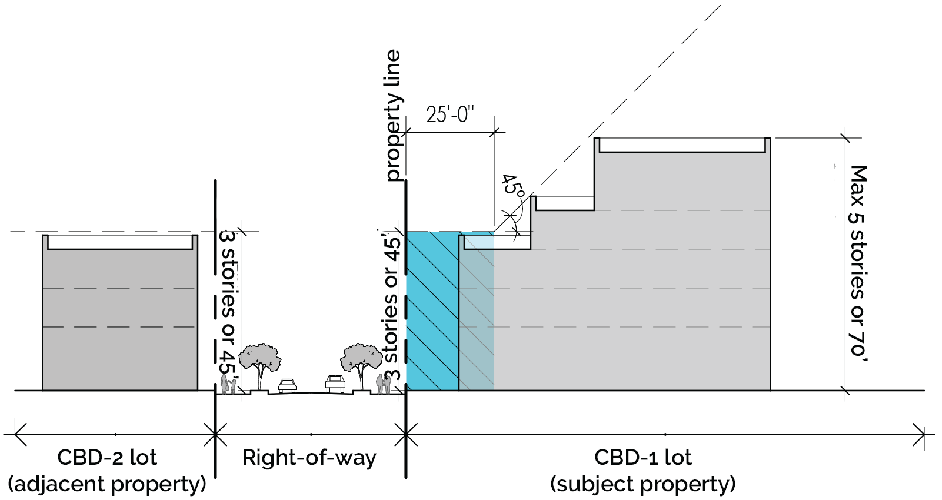 When adjacent to sensitive uses, the maximum height of all buildings or structures in the CBD shall be forty-five (45) feet or three (3) stories, whichever is less, for a horizontal distance of twenty-five (25) feet from the property line in toward the subject lot. At the point twenty-five (25) feet into the property, the height of the building can increase at a forty-five (45) degree angle up to a maximum height of seventy (70) feet or five (5) stories, whichever is less, depending on the maximum height of the sub-area.