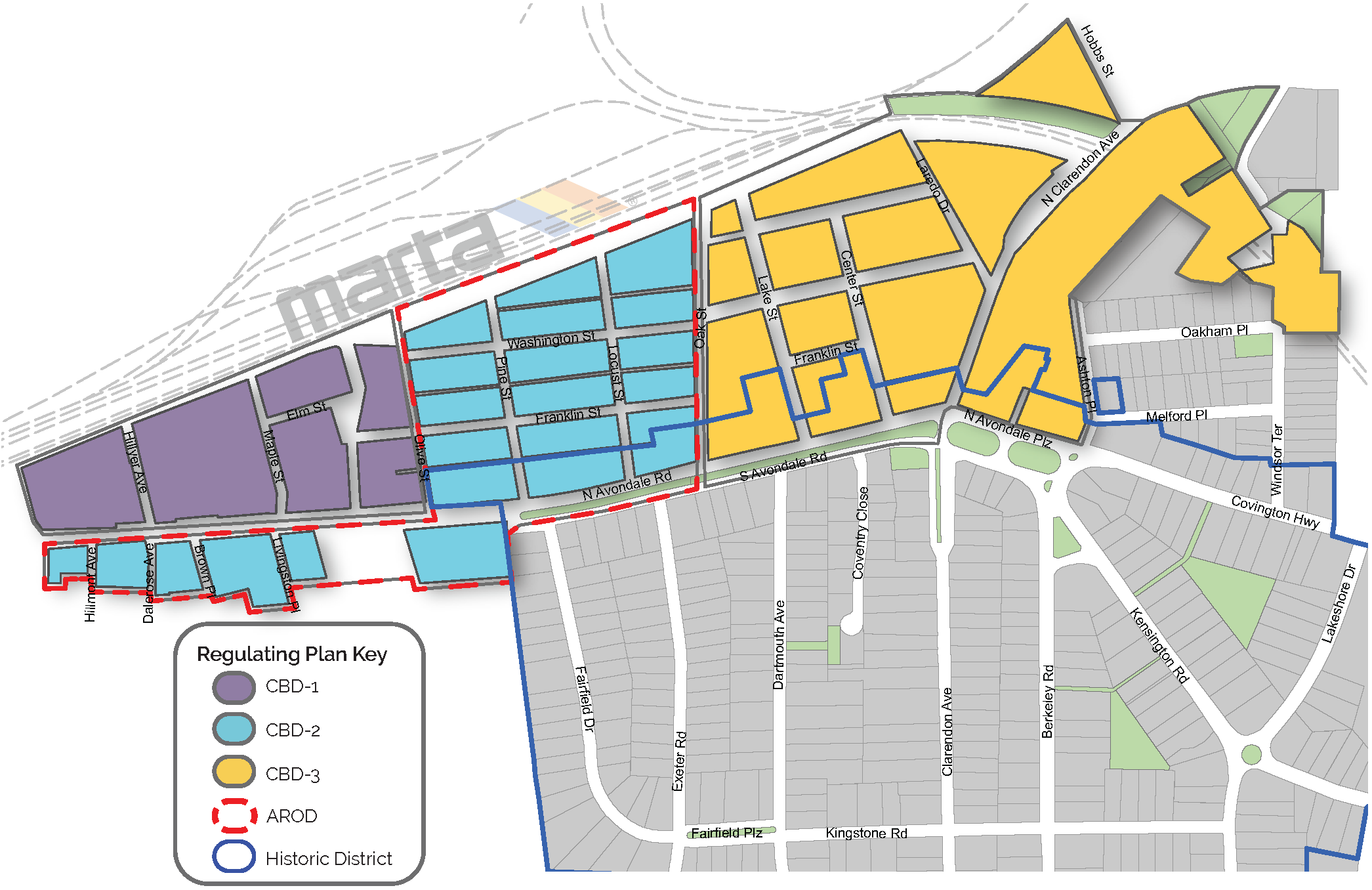 The CBD-1 sub-area is intended to accommodate the most intensive scale of development, still respecting the maximum grid dimensions and small-town, walkable feel of the overall district. Within a 1,500-foot walkshed of the MARTA heavy rail station, the CBD-1 sub-area is intended to provide housing and commercial uses that support the remainder of the district and encourage transit ridership. Building heights up to five (5) stories are permitted in this district, with required building articulation to break up the massing and transitional height planes to step down the intensity in key locations, such as adjacent to residential uses.