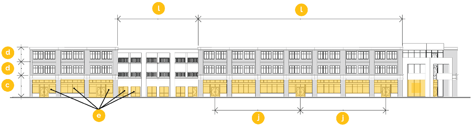 Promote vibrant streets with active ground floors. Orient storefronts to face the street, design main entrances to open onto the street, and increase windows and doors along the ground floor.