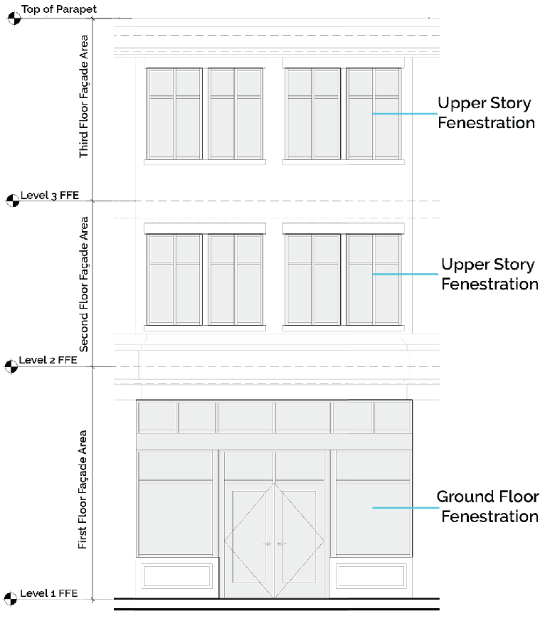 Fenestration is the minimum percentage of window and door glass that must cover a façade, pursuant to table 21-3.2.9 - façade types. It is calculated based façade area and by floor. The façade area used to determine fenestration is measured from the top of the finished door to the top of the finished floor above or top of a roof parapet.