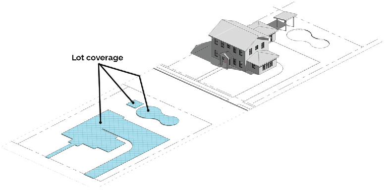 Lot coverage: Lot coverage is measured as the area or percentage of a lot that is covered by buildings, structures, swimming pools, streets, sidewalks, patios, decks, driveways, parking areas and other impervious surfaces, often expressed as impervious surface ratio (ISR). Trail improvements that are part of a board of mayor and commissioners-approved plan are not counted as part of a site's impervious surface area for purposes of site development-related calculations and regulations. Lot coverage is used synonymously with impervious coverage.