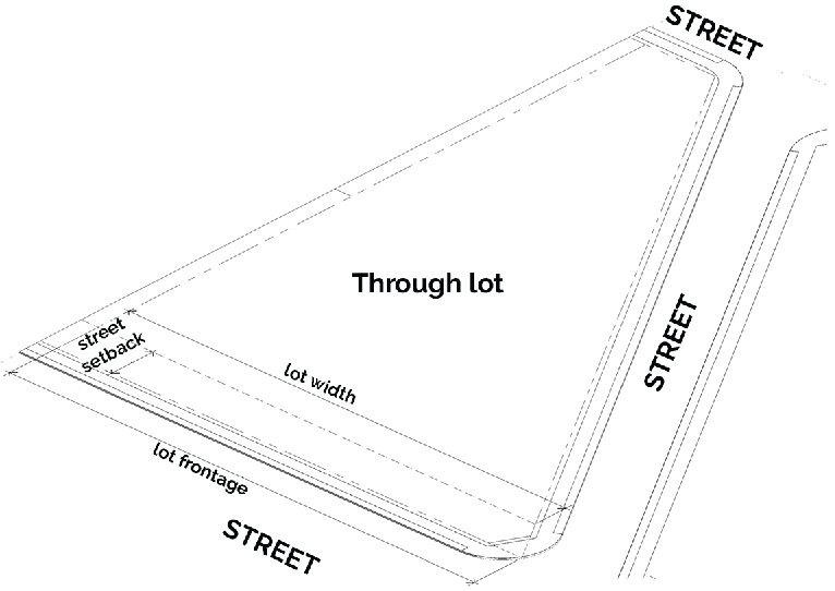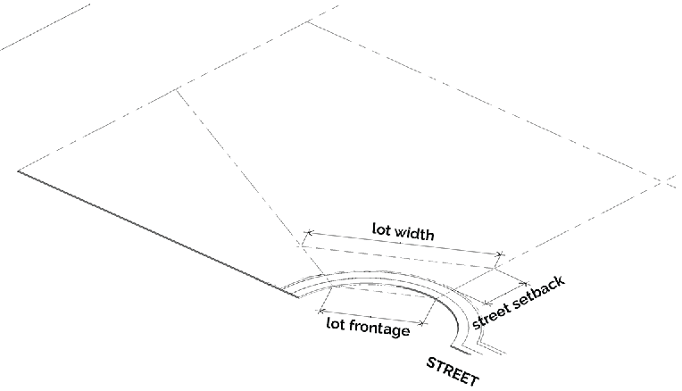 Lot width: Lot width is measured as the distance between the side lot lines, measured along a line drawn parallel to the front lot line at a distance from the front lot line equal to the minimum street yard setback. For lots with curvilinear frontage and setback lines (e.g.: cul-de-sac lots), the width shall be measured as a straight line through the points that intersect the side lot lines at a distance from the front lot line equal to the minimum street yard setback.
