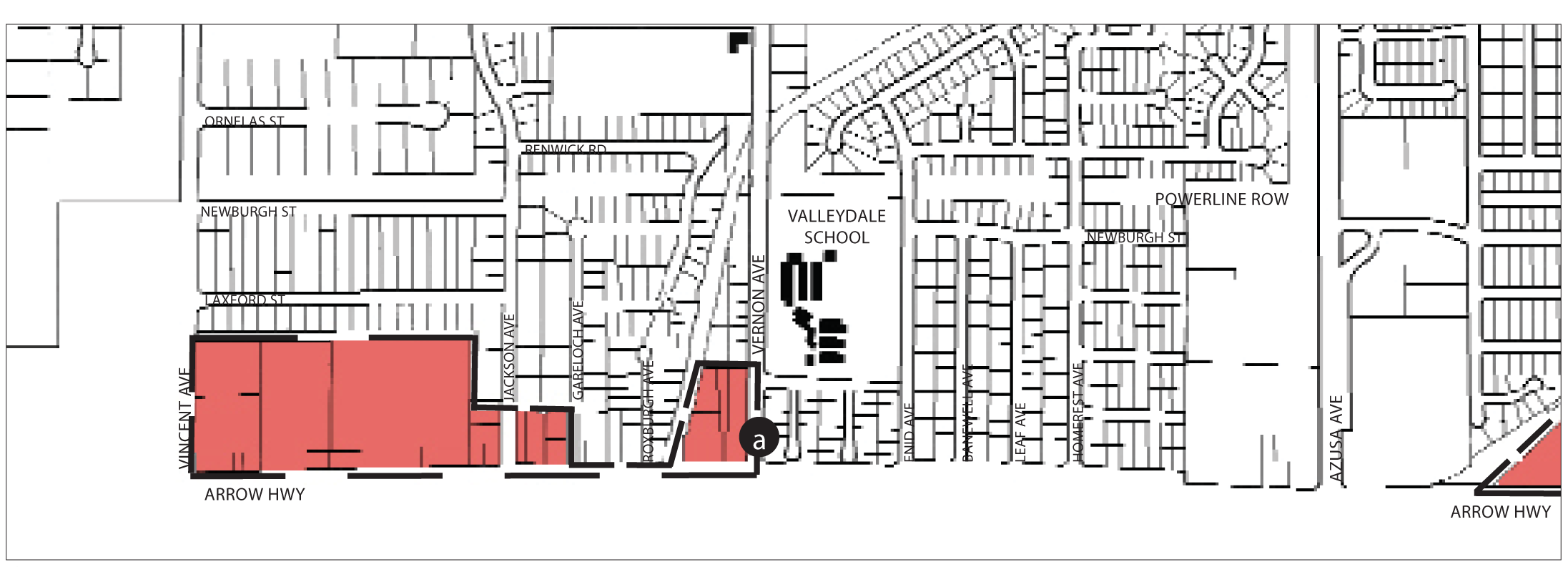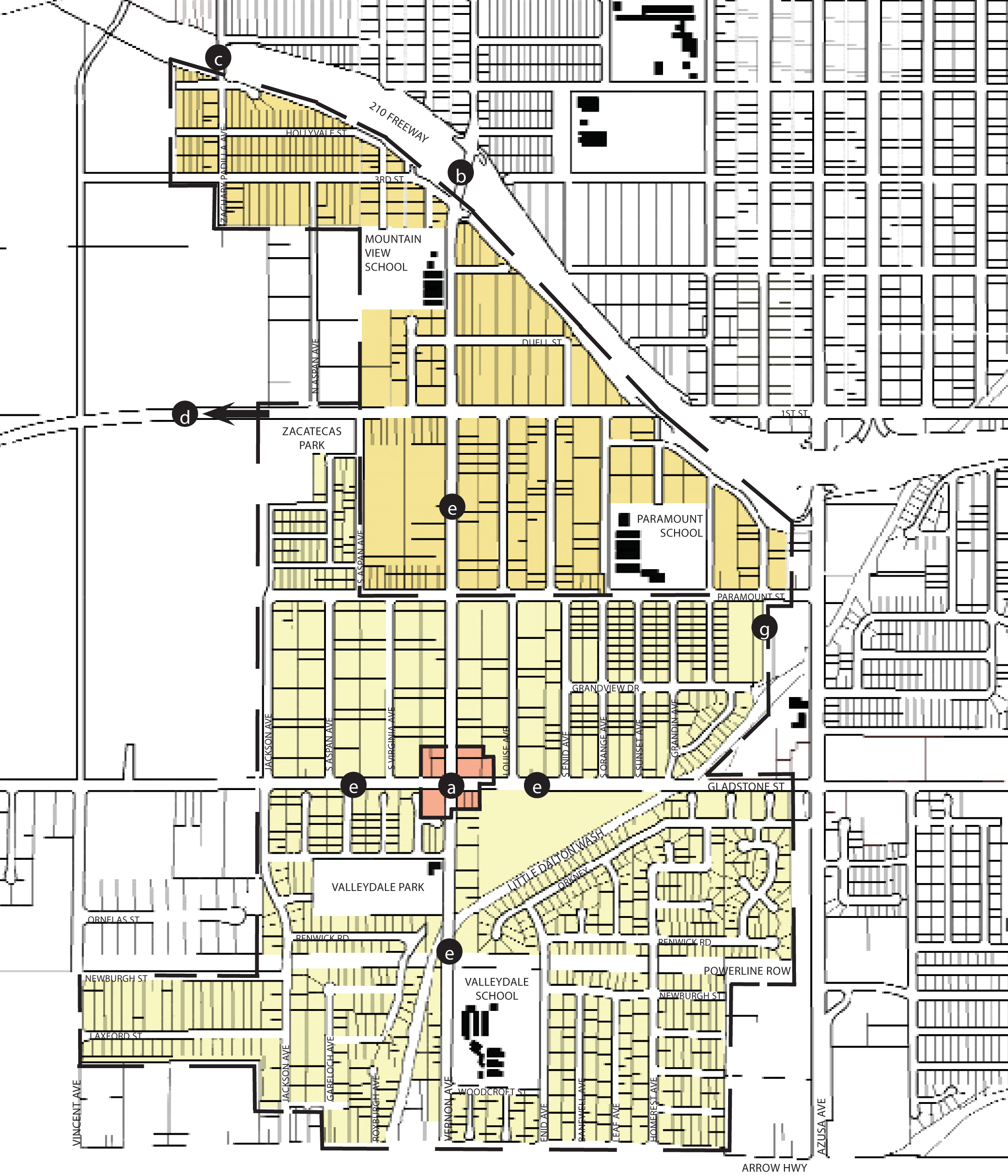 Civic and Commercial Features. Three elementary schools are located in the southwest neighborhoods: Mountain View School, Paramount School, and Valleydale School. These schools and playfields could potentially become the social and civic center, but they have few trees. Zacatecas and Valleydale Parks are also centrally located in these neighborhoods, and are heavily used. Retail in these neighborhoods is predominately strip development on Azusa Avenue, with a church and local retail at the corner of Vernon Avenue and First Street.