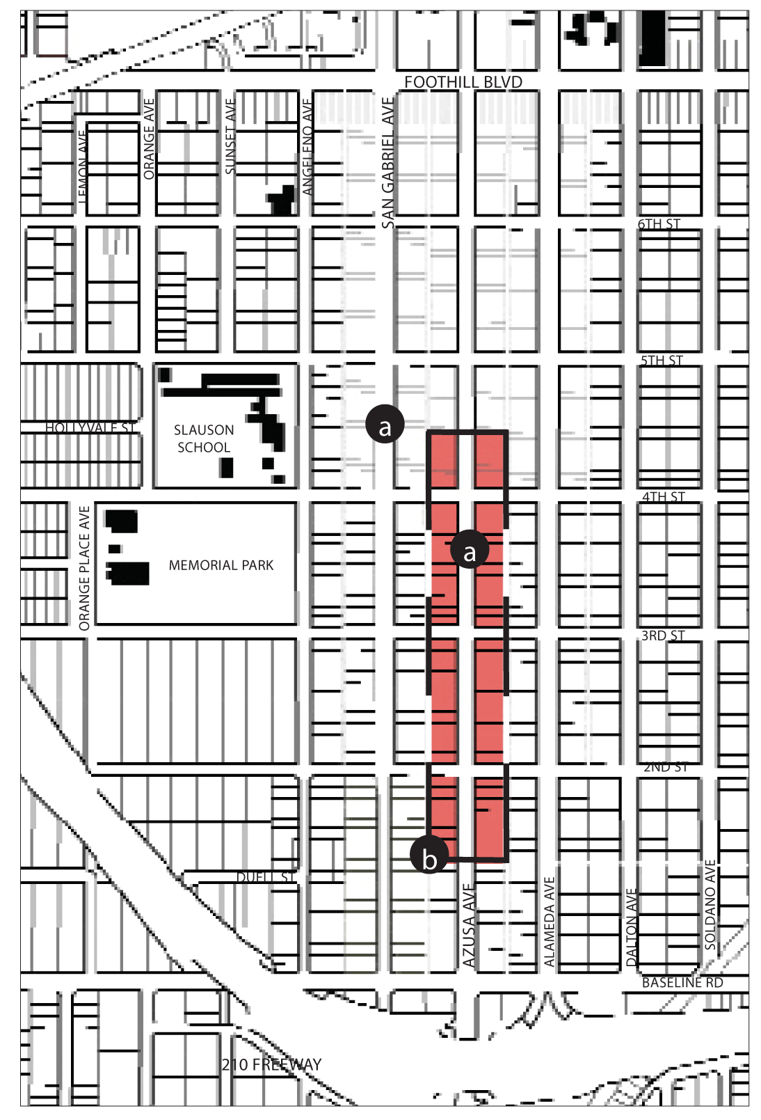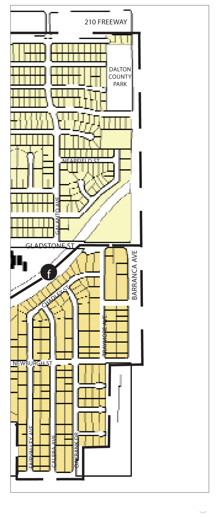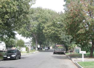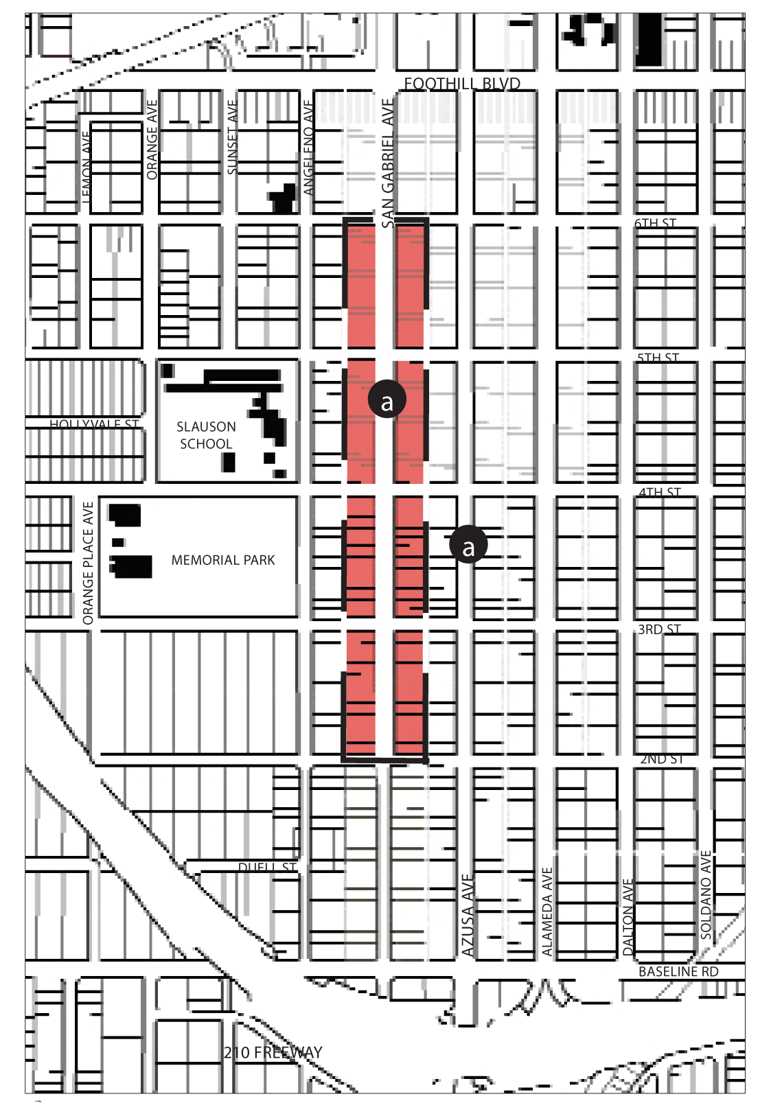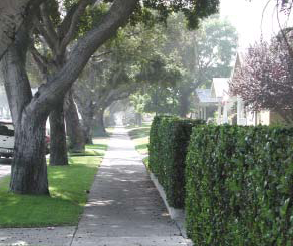 Streets and Landscape. Streets in the Southwest Neighborhoods generally run north-south, creating rectangular blocks. Throughout the neighborhoods, public landscape is inconsistent - street trees do occur they are often different species, sizes, and shapes. The trees that do exist are typically large and mature. Within the center of the southwest neighborhoods is an interconnected street grid of character and familiarity, which decentralizes traffic. This street grid breaks down to the north and south - only Zachary Padilla Avenue and Vernon Avenue cross the 210 Freeway, and areas in county jurisdiction contain cul-de-sac developments. Although several streets can be entered from Arrow Highway to the south, there is only one street entry from the east and west and no entry from Gladstone Street to the north. This lack of access concentrates traffic in and out of the neighborhoods onto a few streets and intersections.