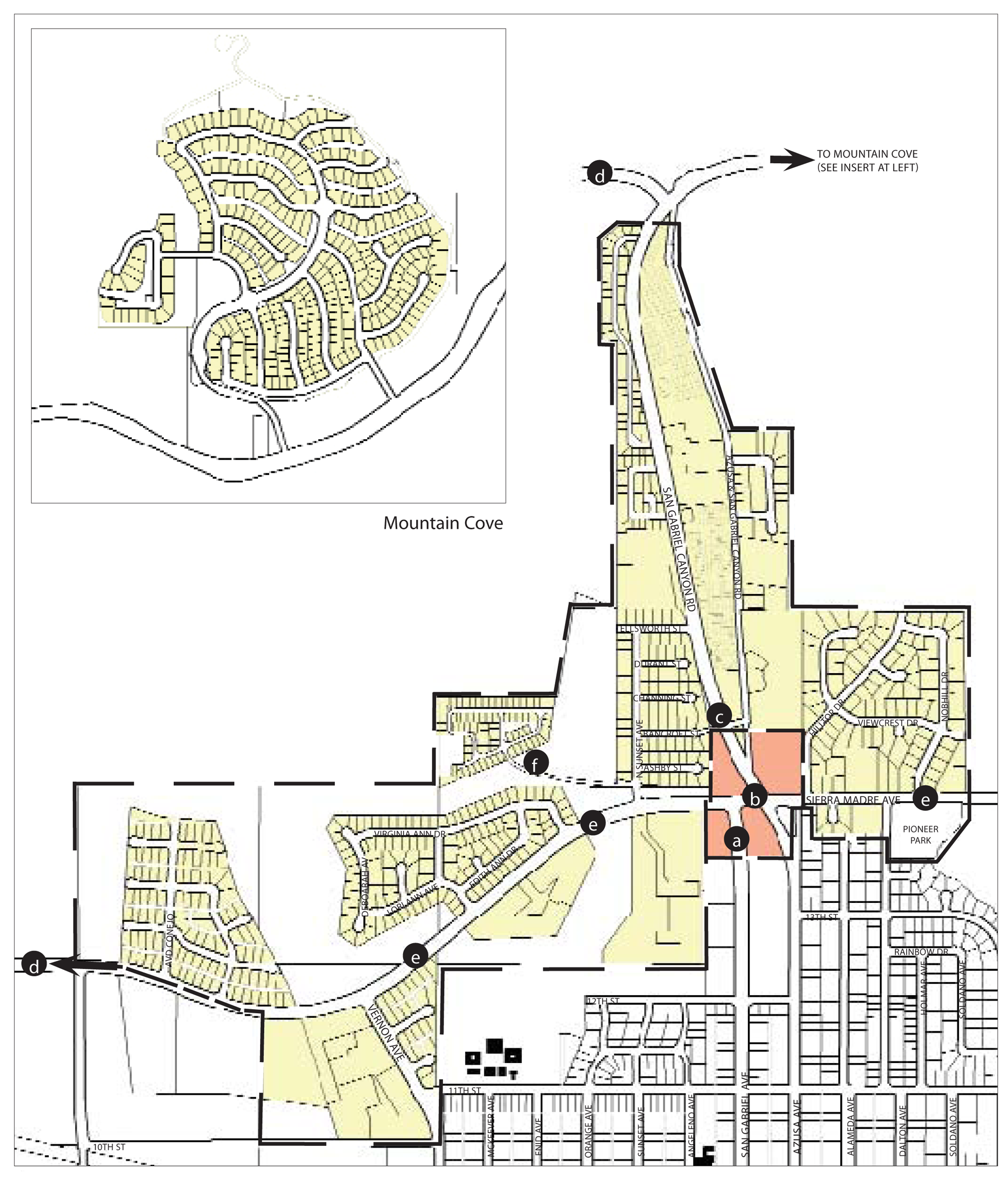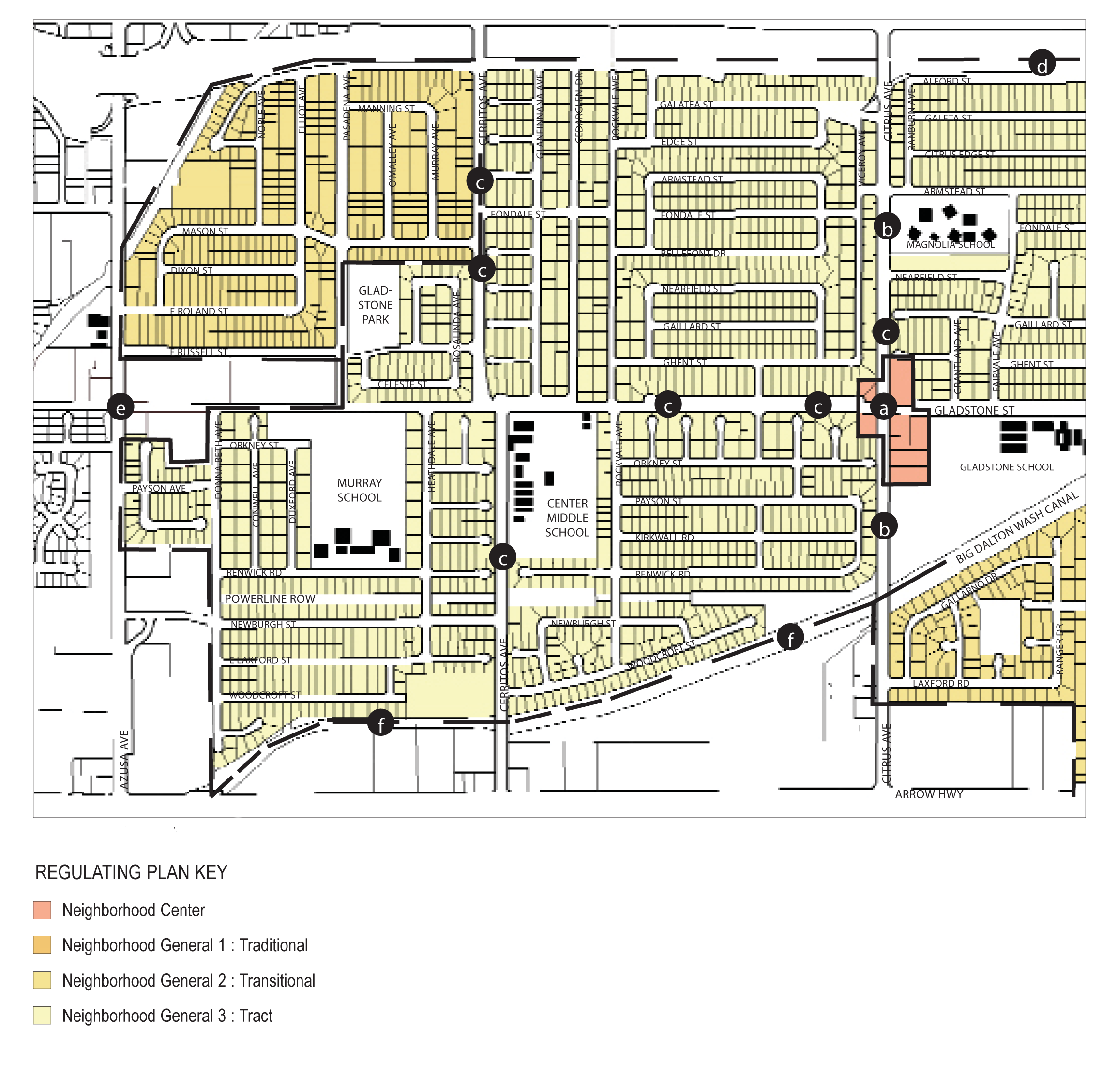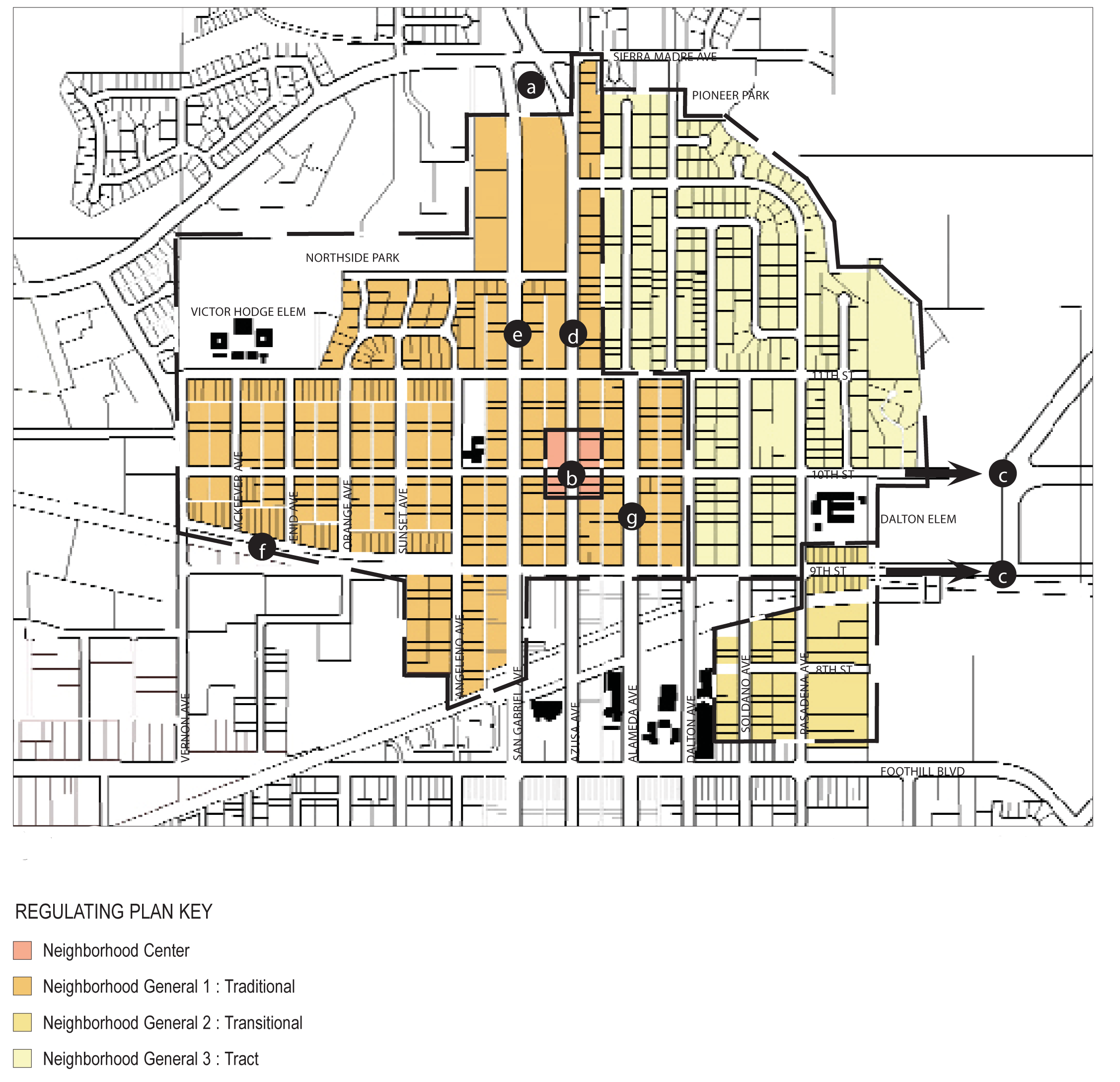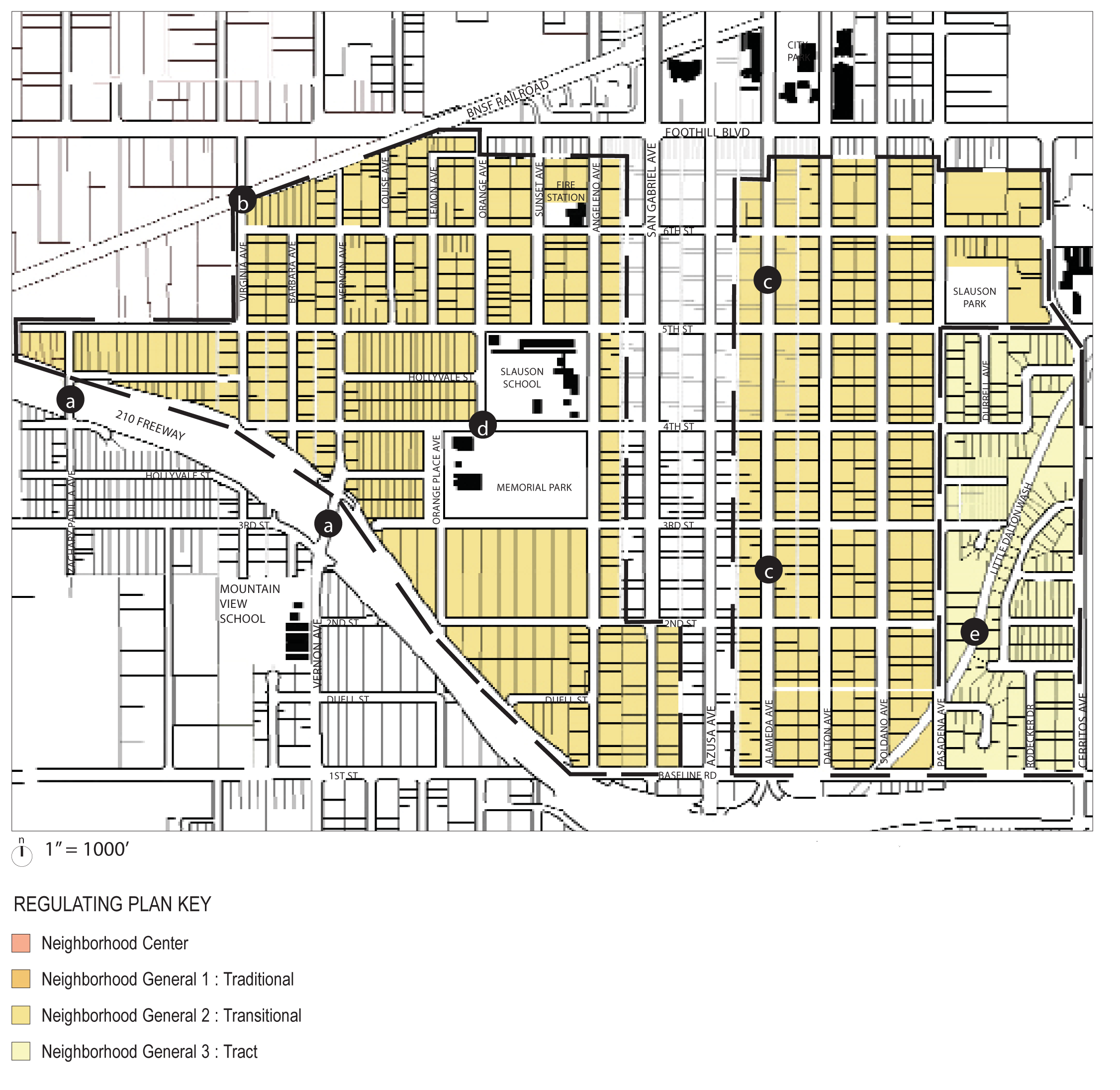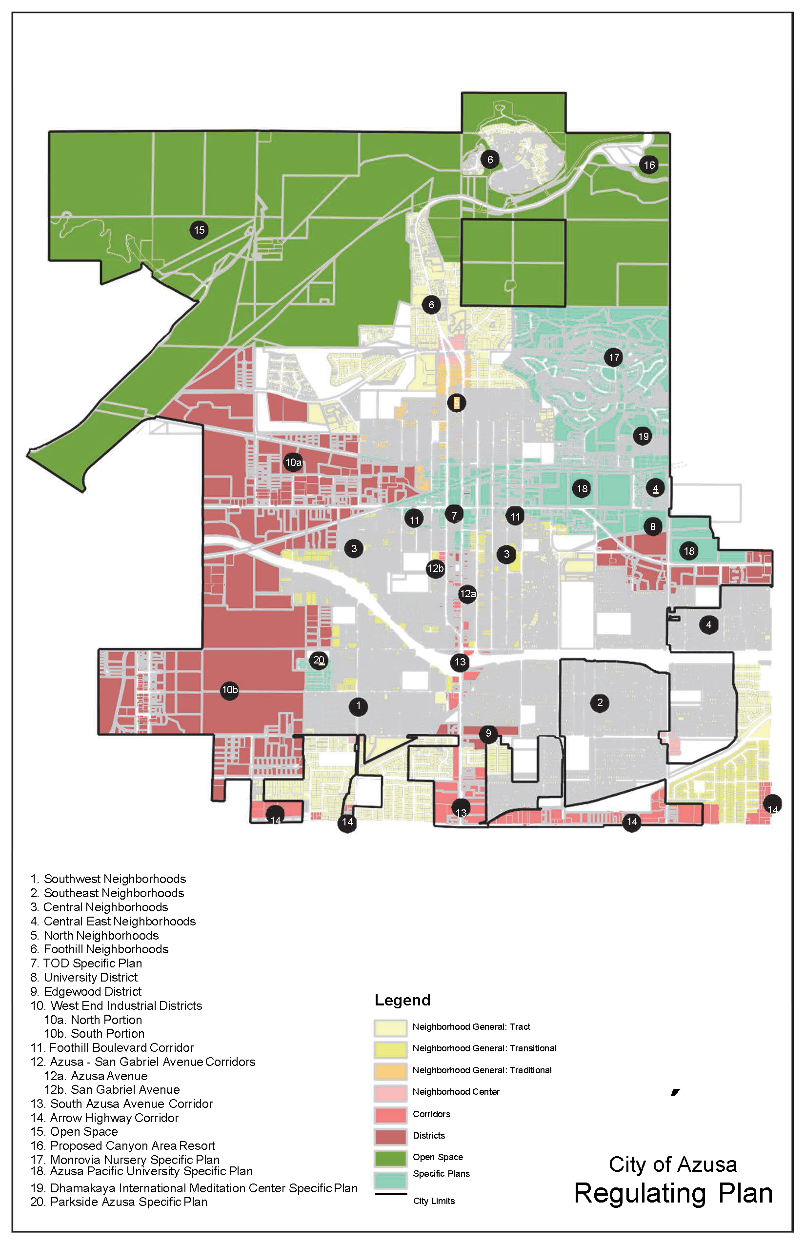 The planning areas described in the following chapters identify different geographic areas of Azusa in terms of Neighborhoods, Districts, and Corridors. The areas identified as neighborhoods are now mostly developed with individual homes. However, several of the neighborhoods have the potential to, over time, become places where additional types and sizes of housing are available, and where residents will have the option of a convenient walk to reach stores, other businesses and public facilities that cater to their daily needs, instead of needing a car for all such trips. The grouping of various neighborhoods on the Regulating Plan (for example, the Southwest Neighborhoods, and Foothill Neighborhoods) reflects similarities in their history and current character, and the city's intent that Development Code requirements have similar positive effects within each group of neighborhoods as individual lot development and re-development occur over time.