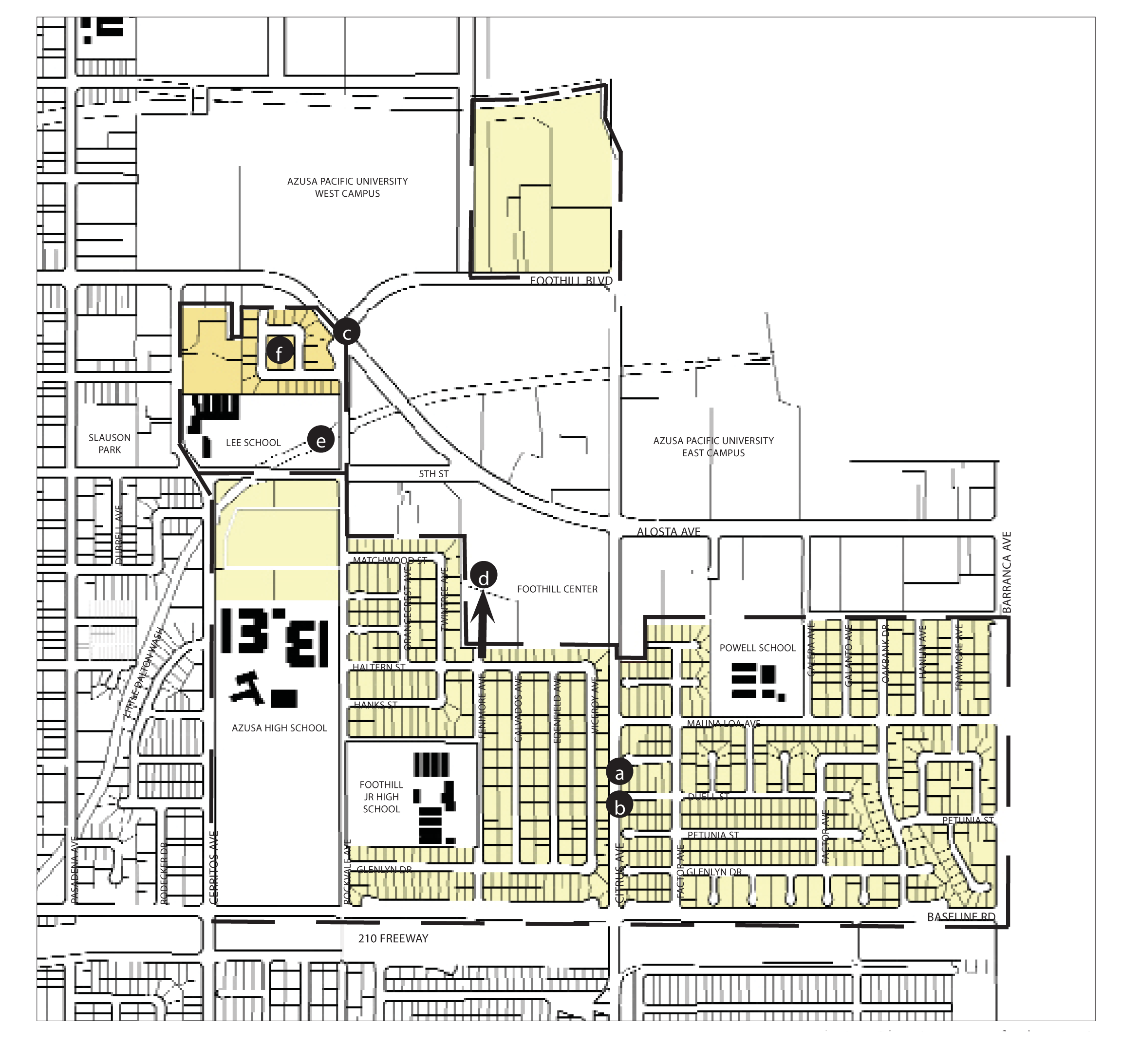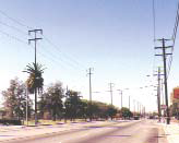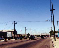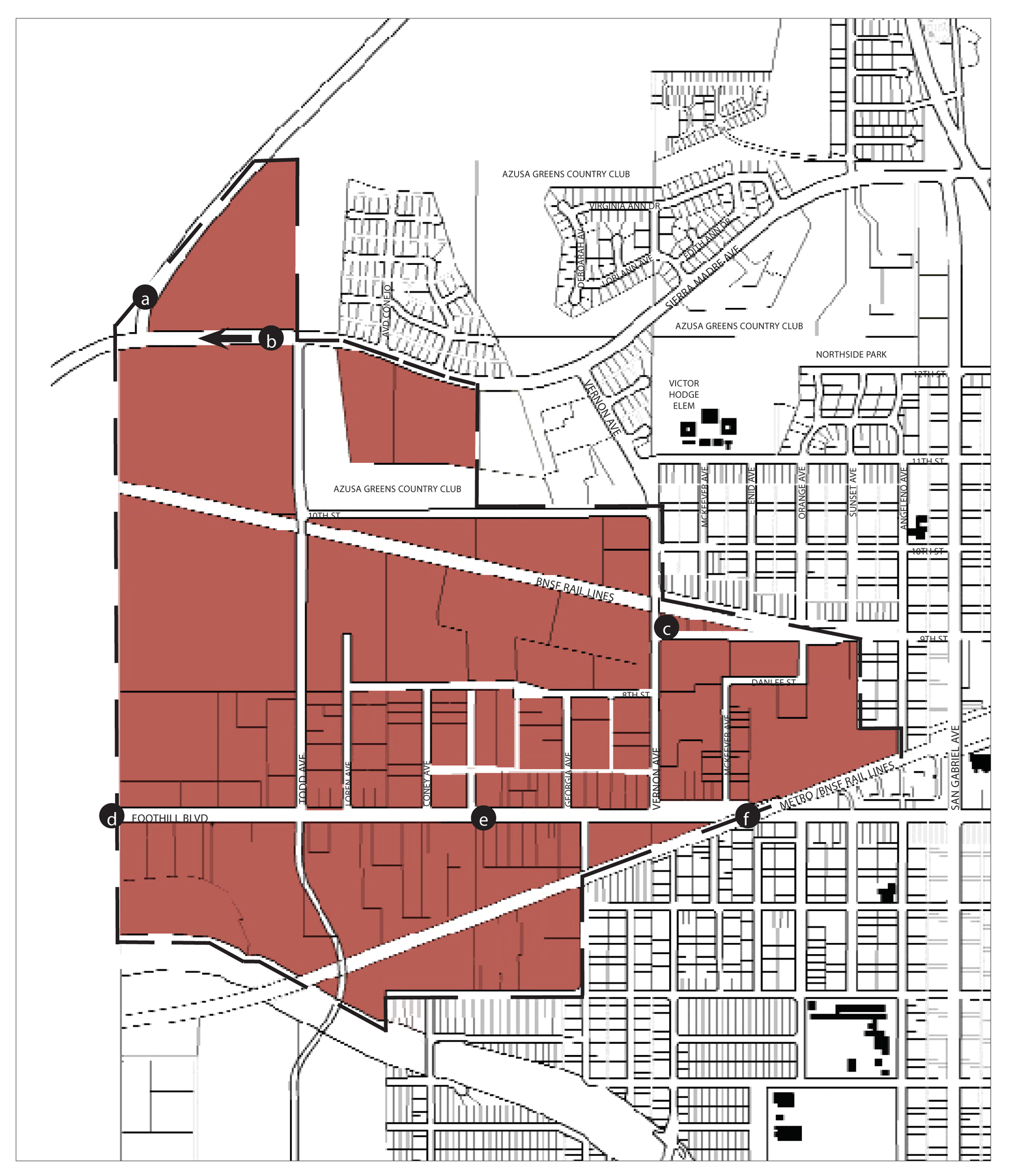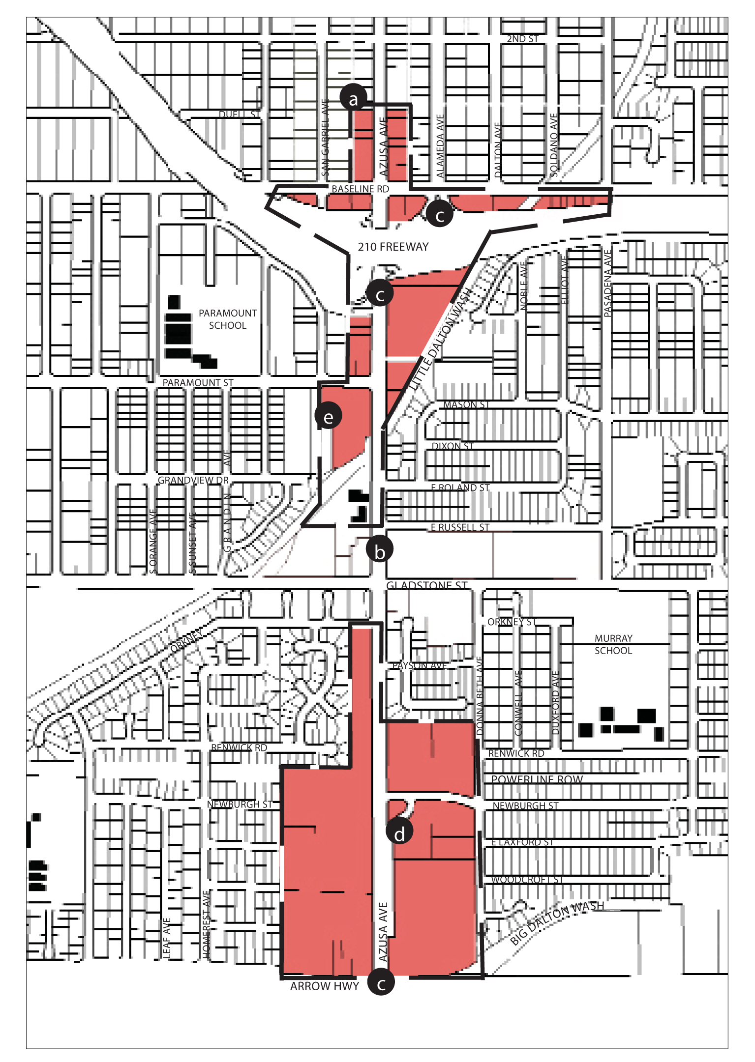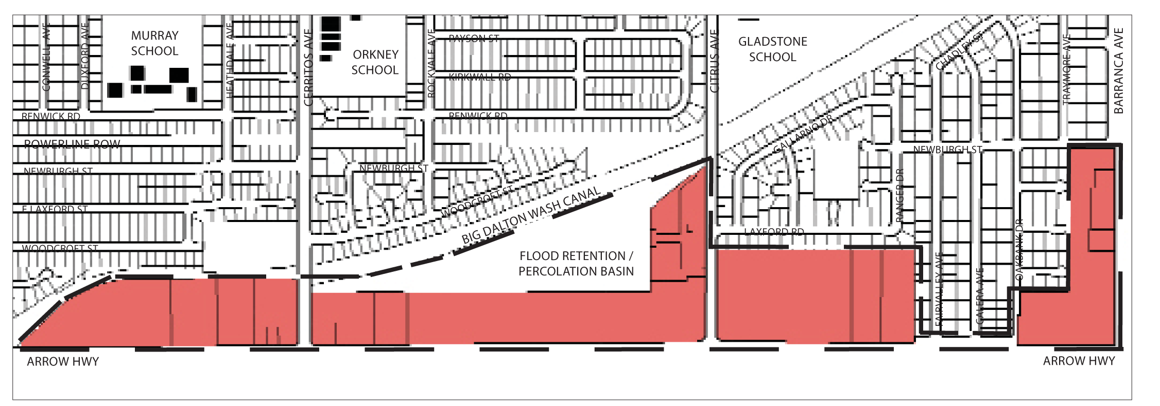 Location and Existing Conditions. The Southwest Neighborhoods of Azusa are located south of the 210 Freeway, west of Azusa Avenue, and north of Arrow Highway. To the west are the city's industrial districts. The Little Dalton Wash flood control channel runs through the southeast portion of these neighborhoods. The wash area is fenced off on both sides and has no landscaping along its edges. High voltage power lines also bisect the Southwest Neighborhoods. The power line right-of-way is used for plant storage by a local nursery. Much of the area isolated by these two regional features is located in unincorporated Los Angeles County. These neighborhoods are directly adjacent to the southern industrial districts, and suffers from the dust and noise produced by quarries, landfills and other land-intensive uses.