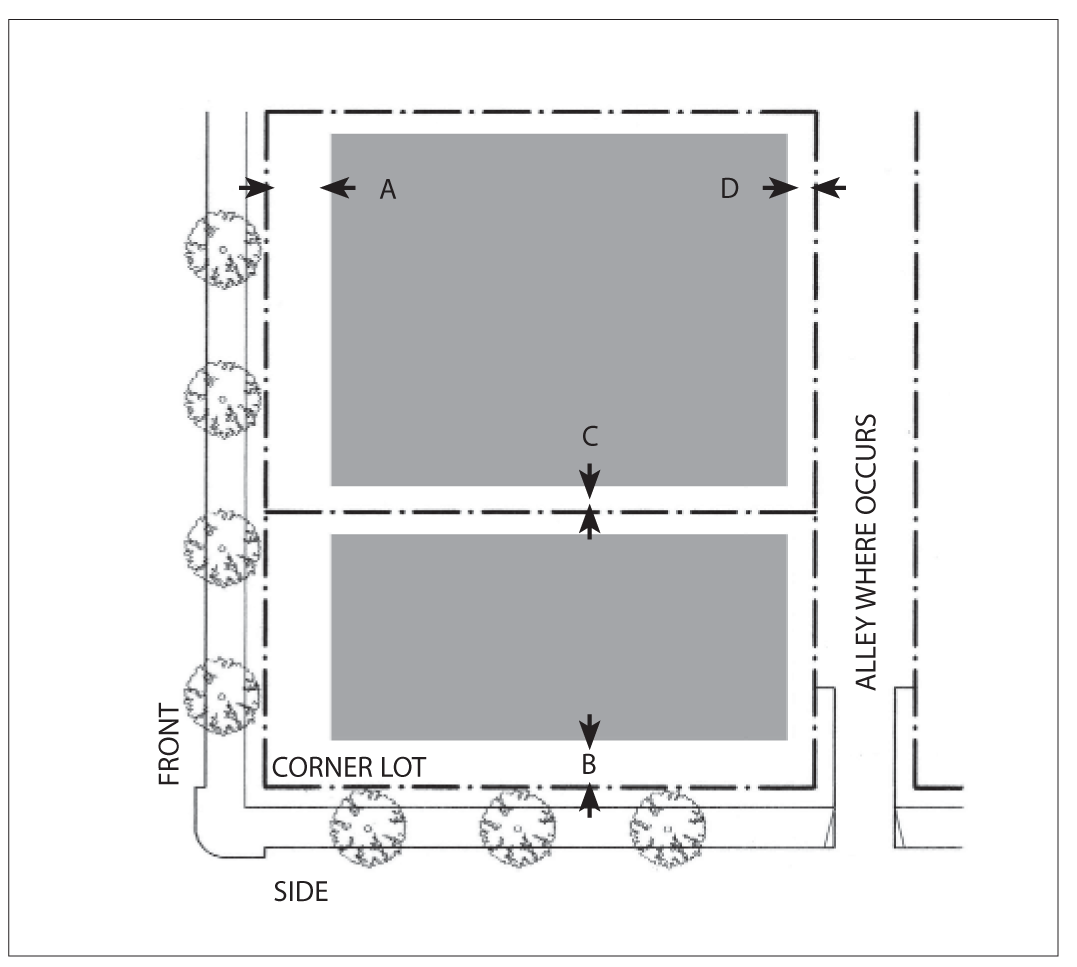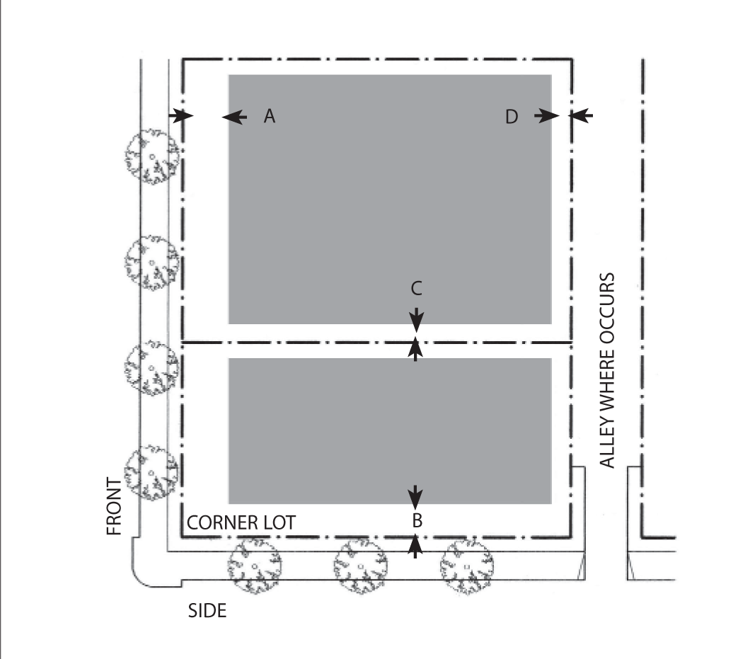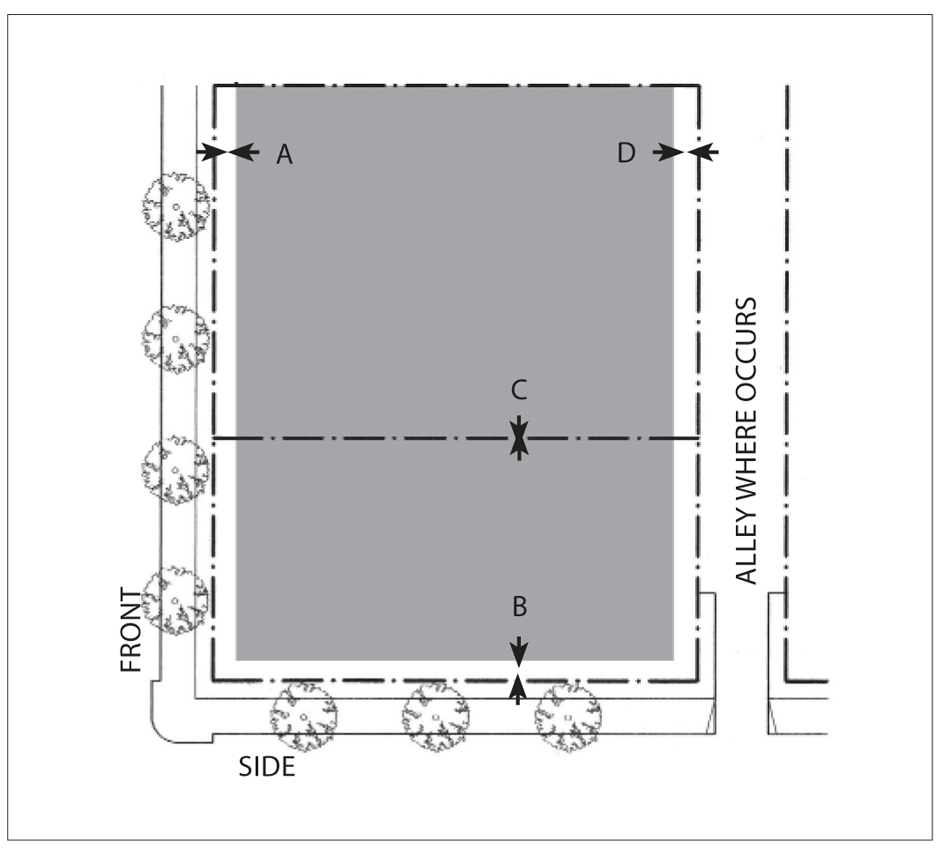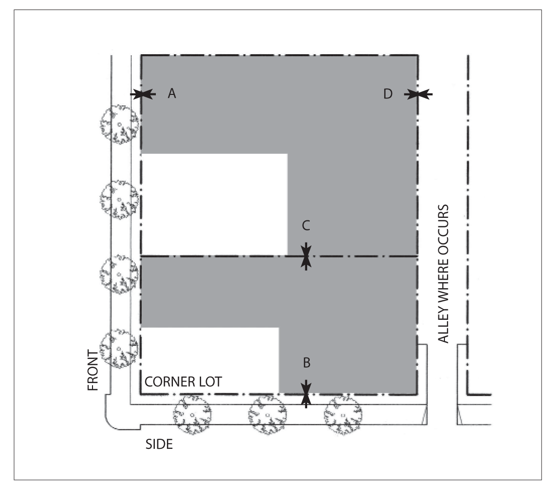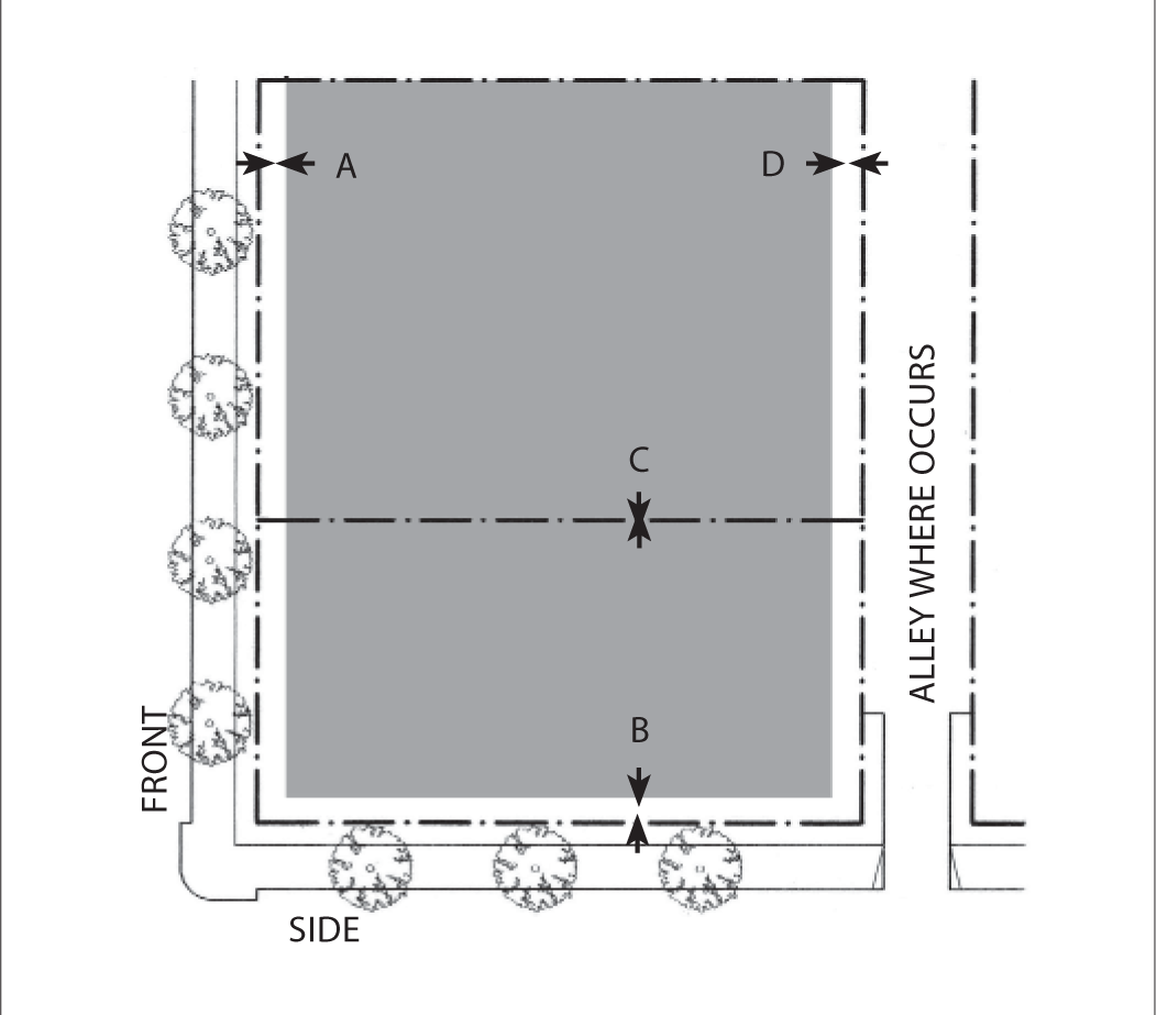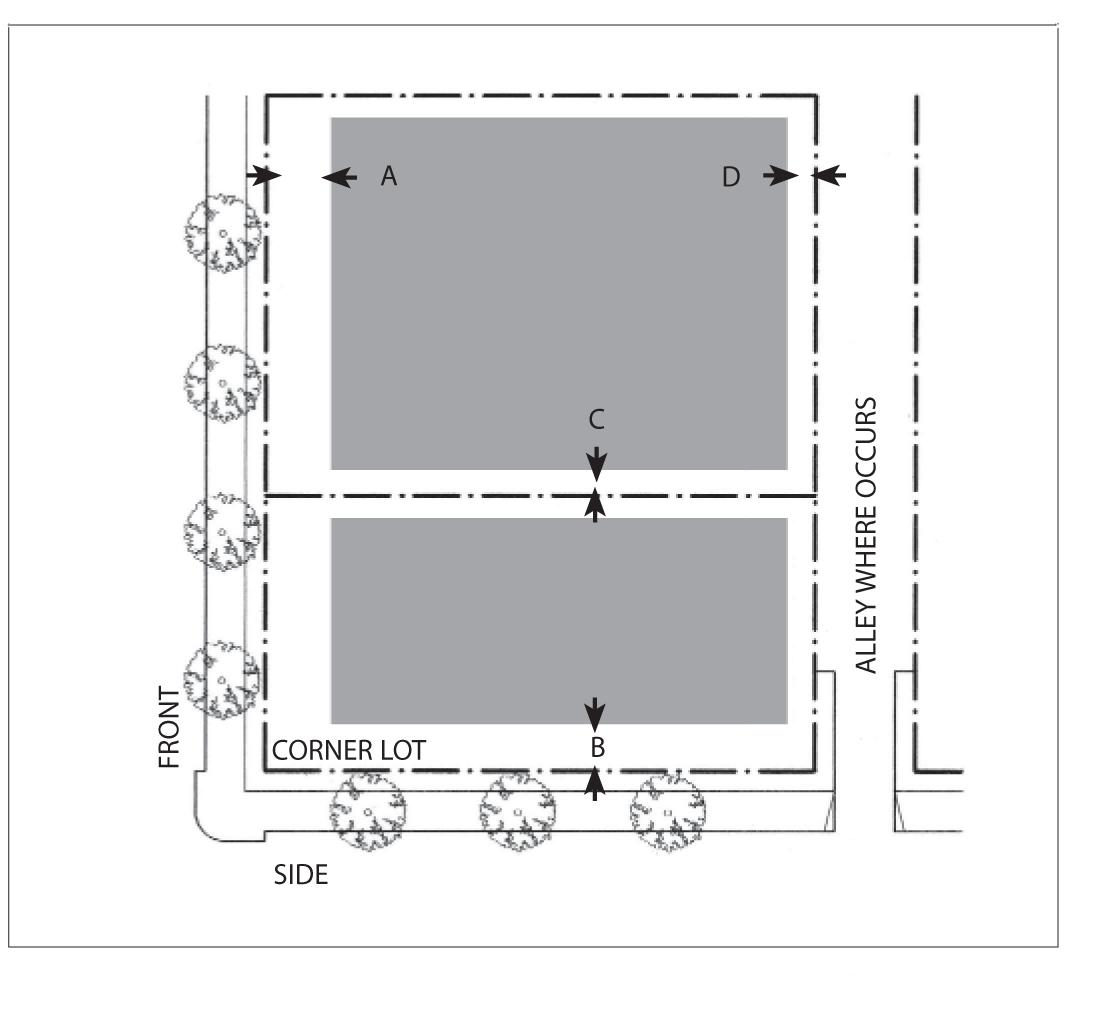 Side Street Setback: 15 feet minimum; 25 feet maximum for 60 percent minimum of lot width.