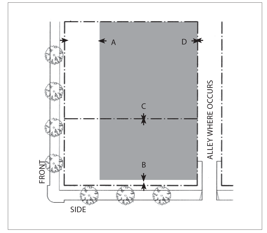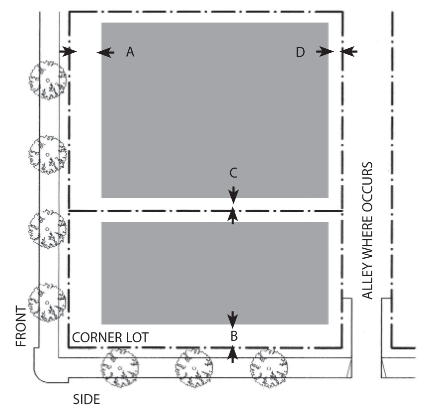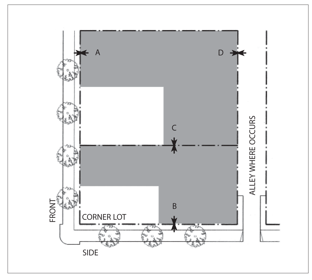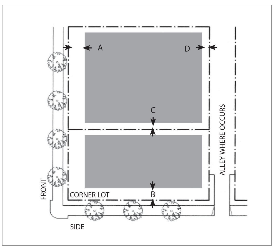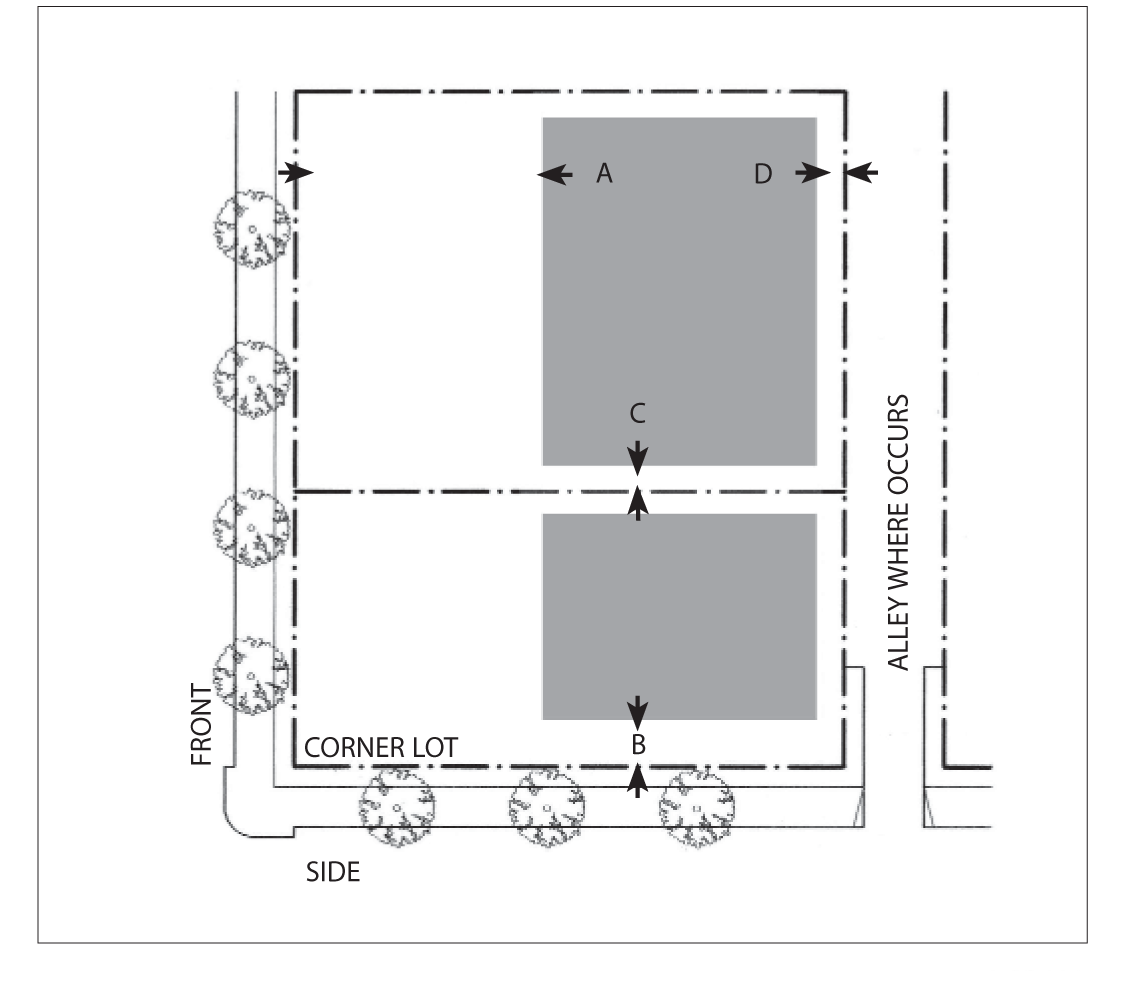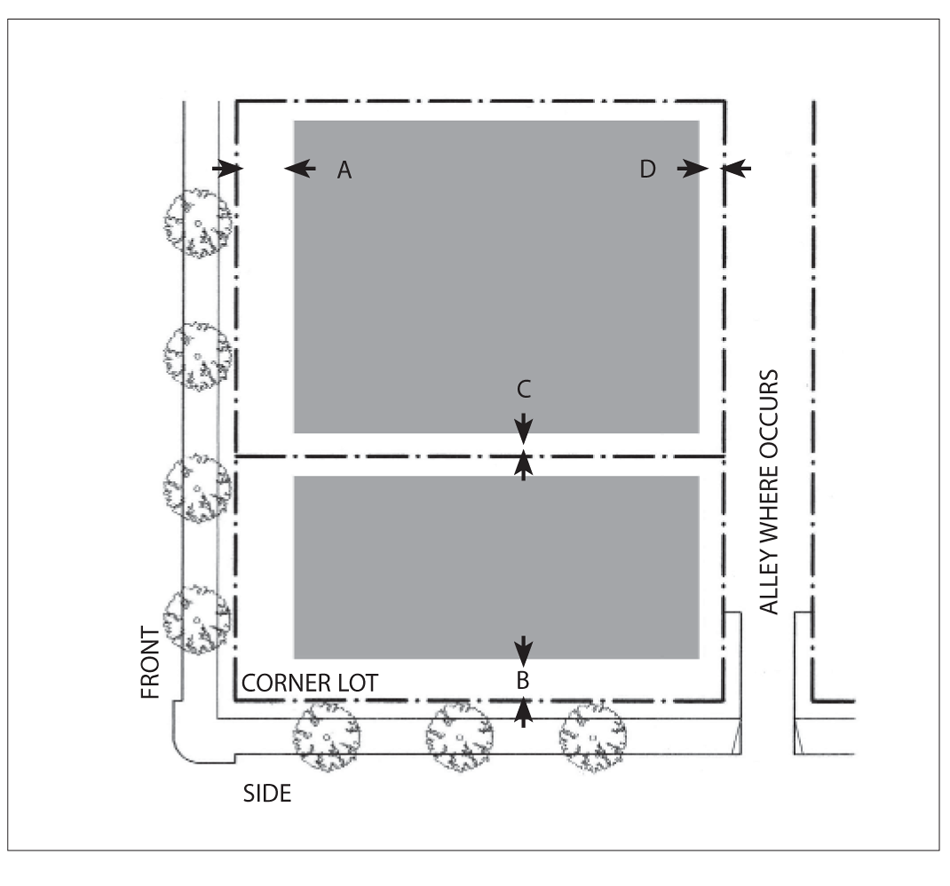 Side Street Setback: 15 feet minimum; 25 feet maximum for 60 percent minimum of lot width.