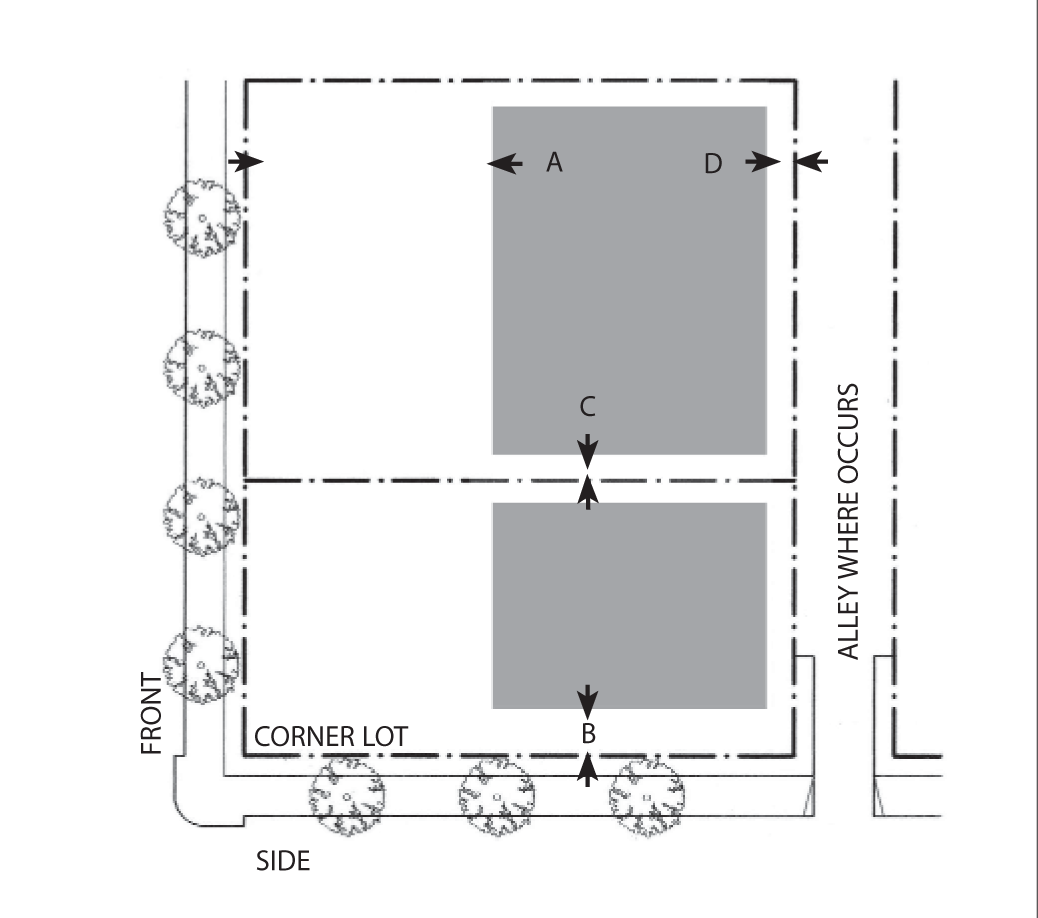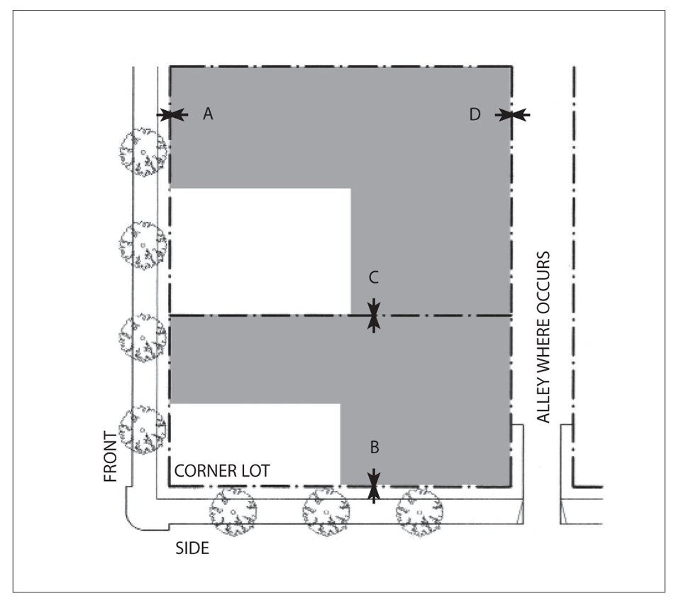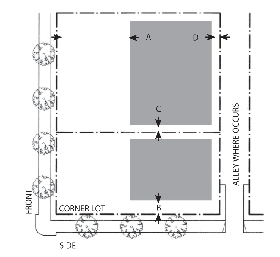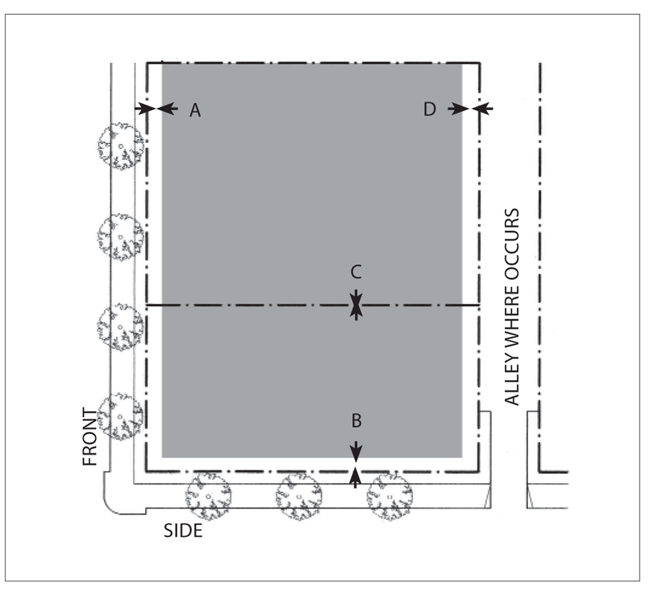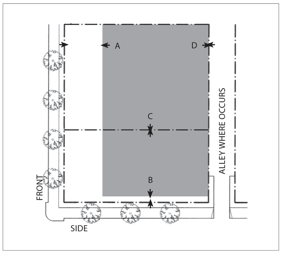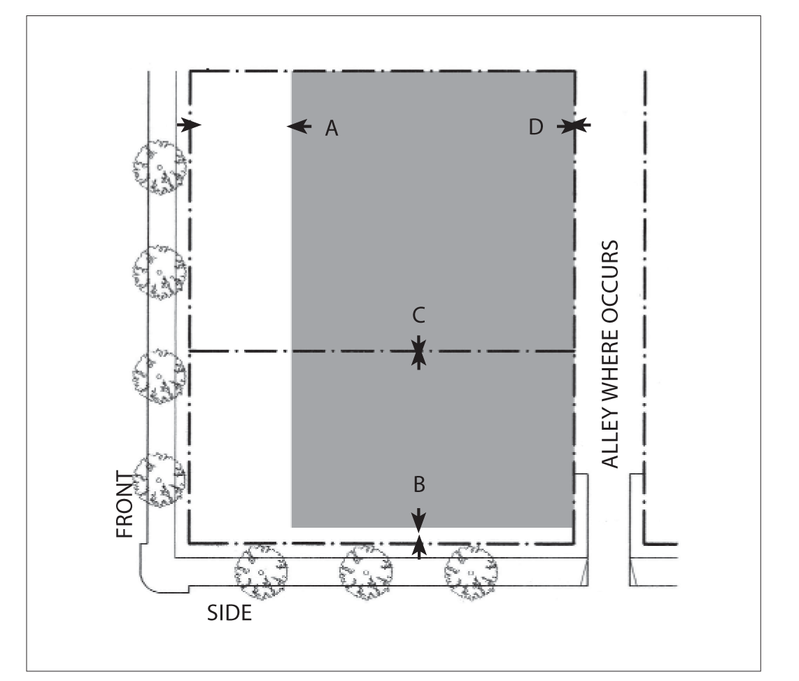Side Street Setback: 15 feet minimum; 25 feet maximum for 60 percent minimum of lot width.