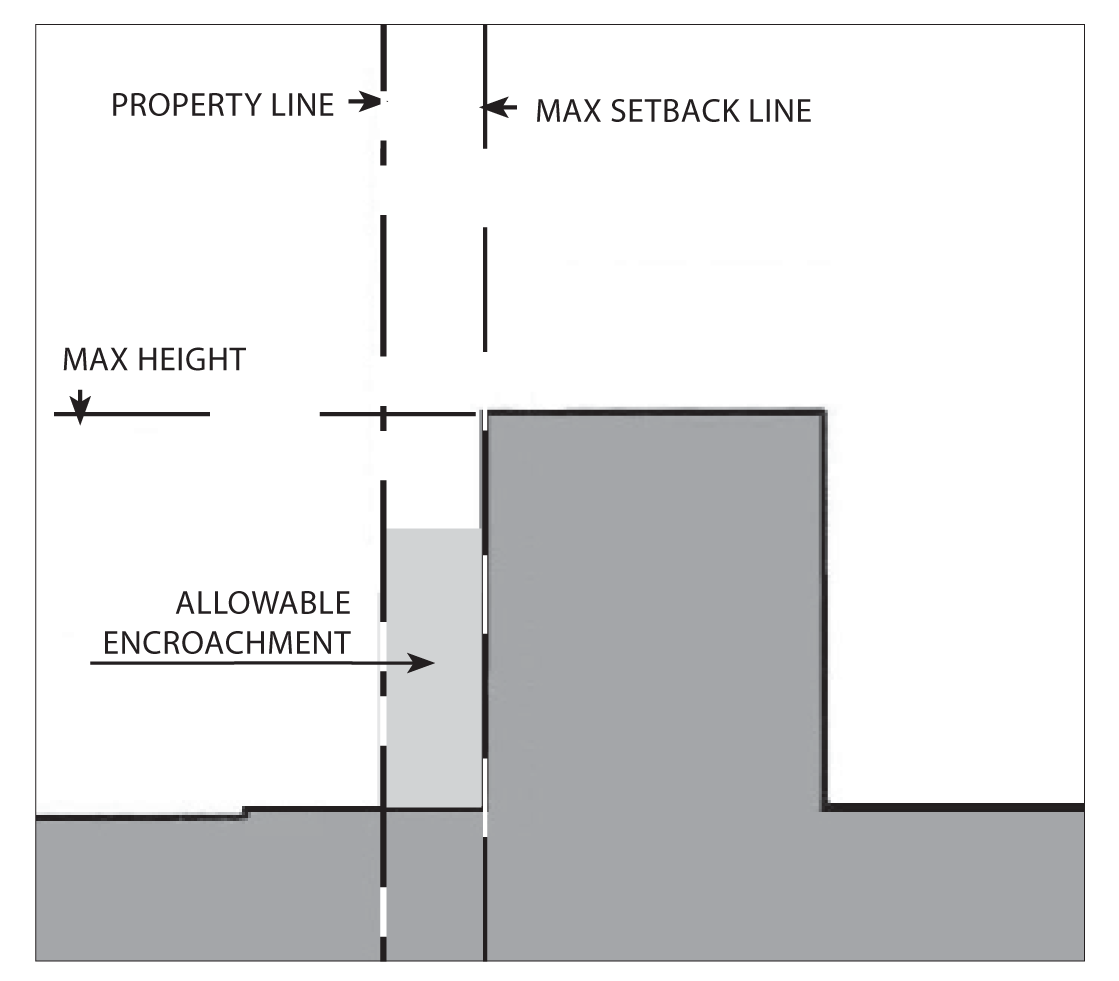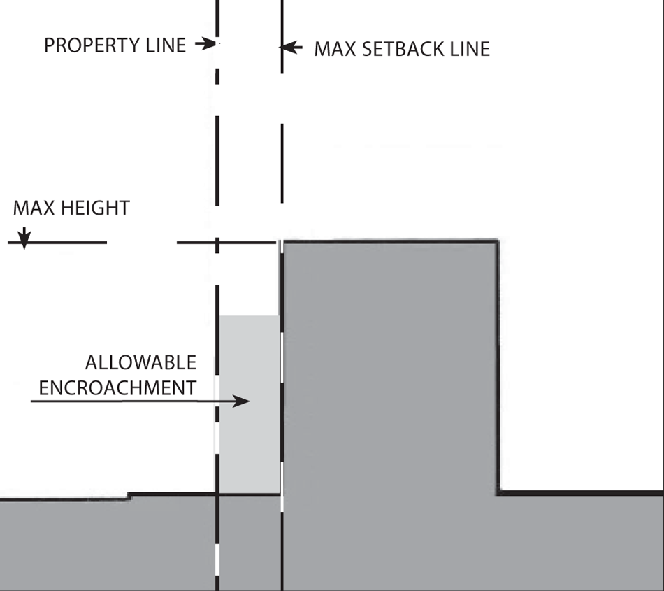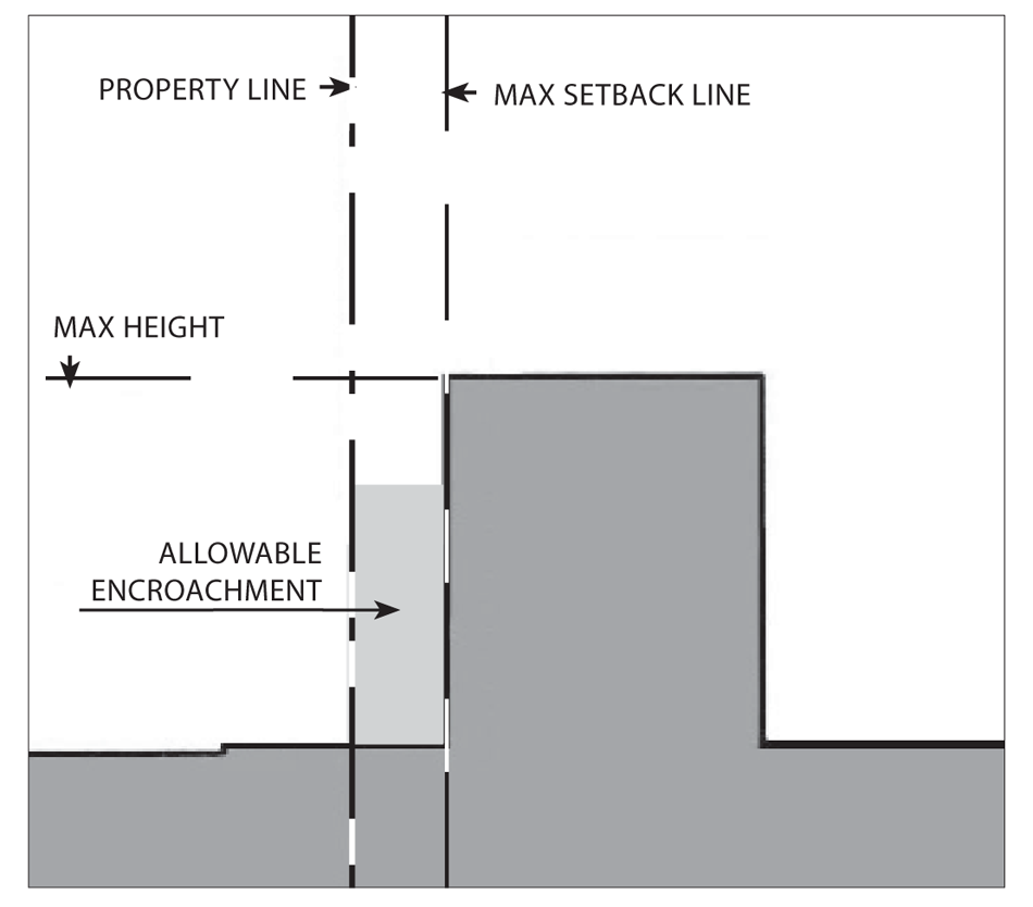 Gallery/arcades, awnings, balconies, porches, and outdoor dining furniture may encroach into the setback and public right-of-way:
