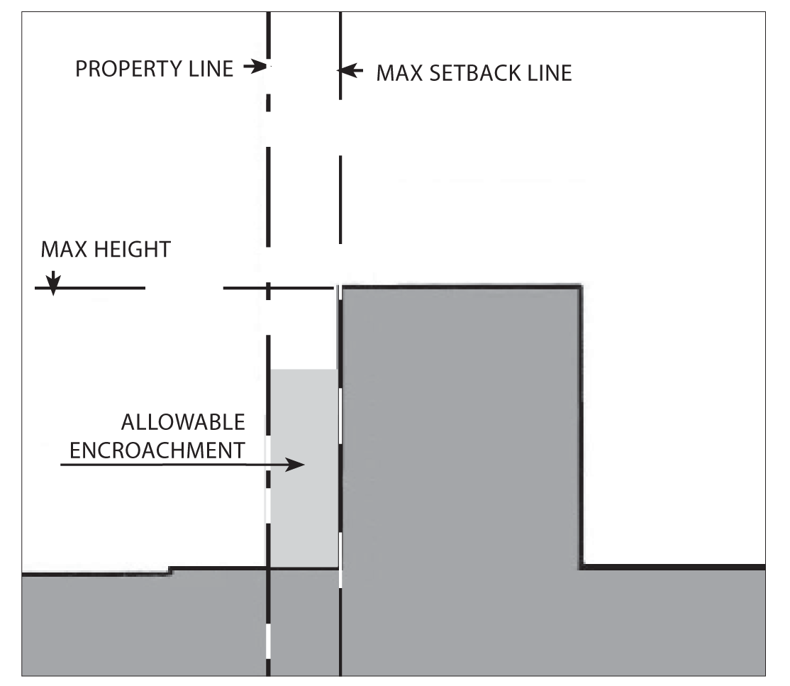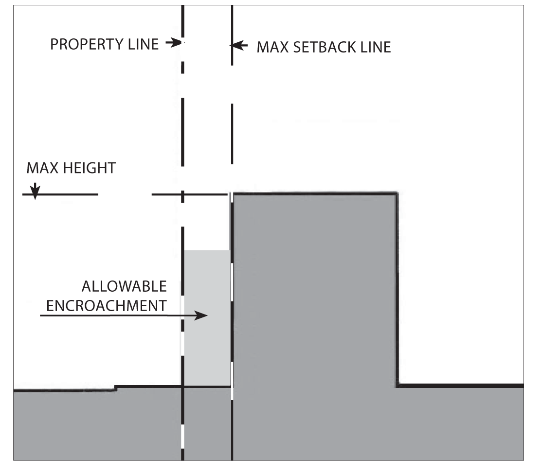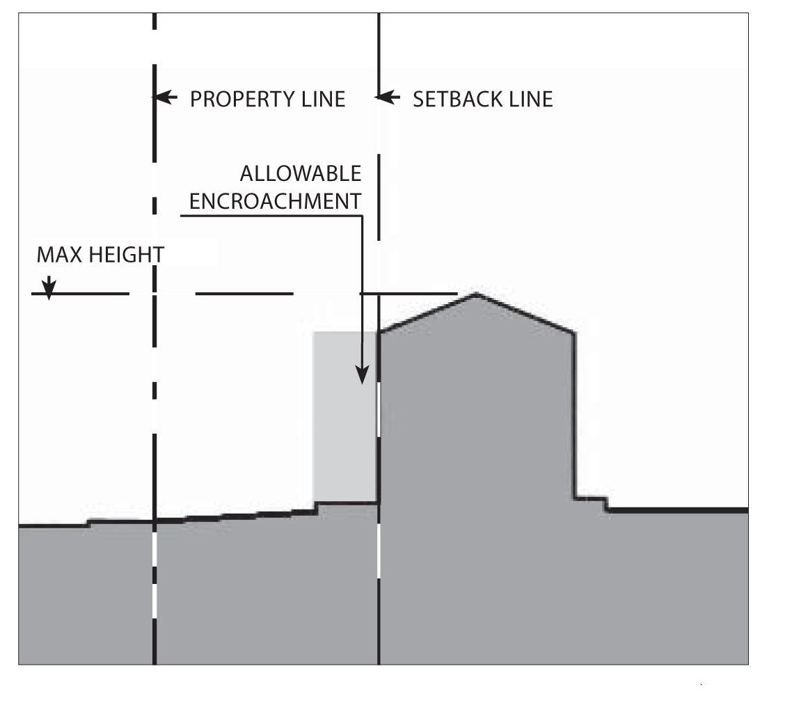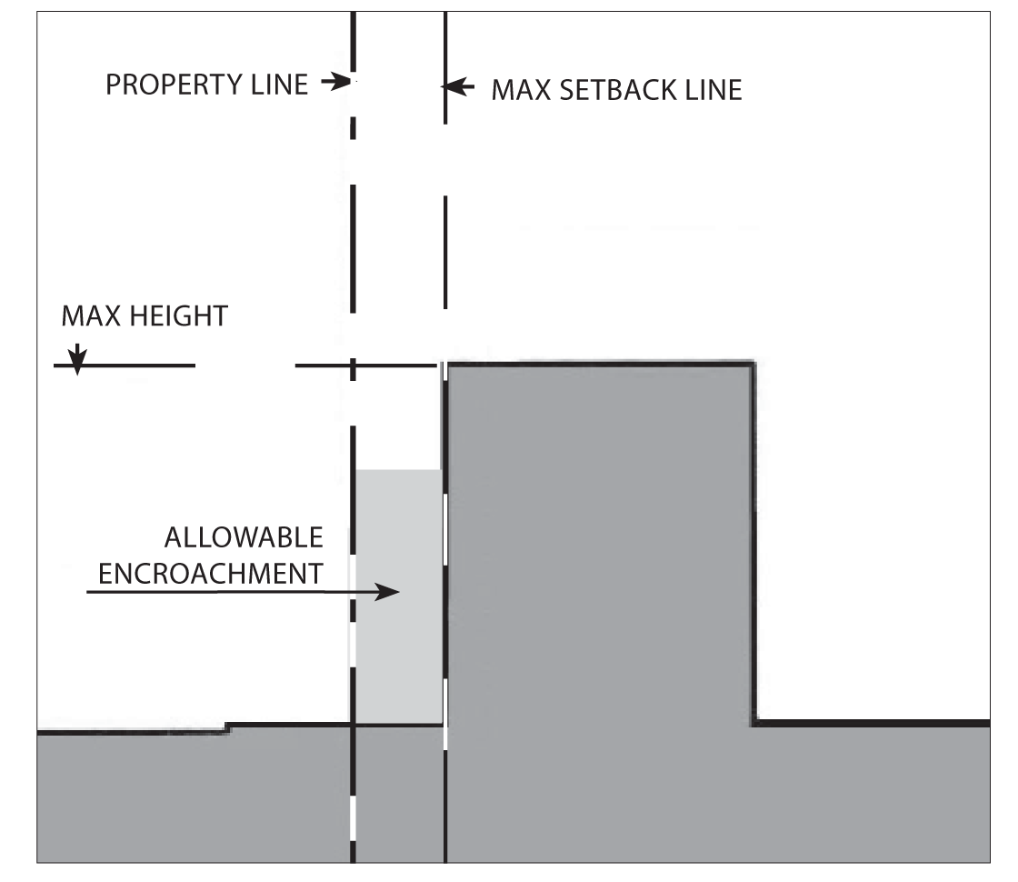 Gallery/arcades, awnings, balconies, porches, and outdoor dining furniture may encroach into the setback and public right-of-way.