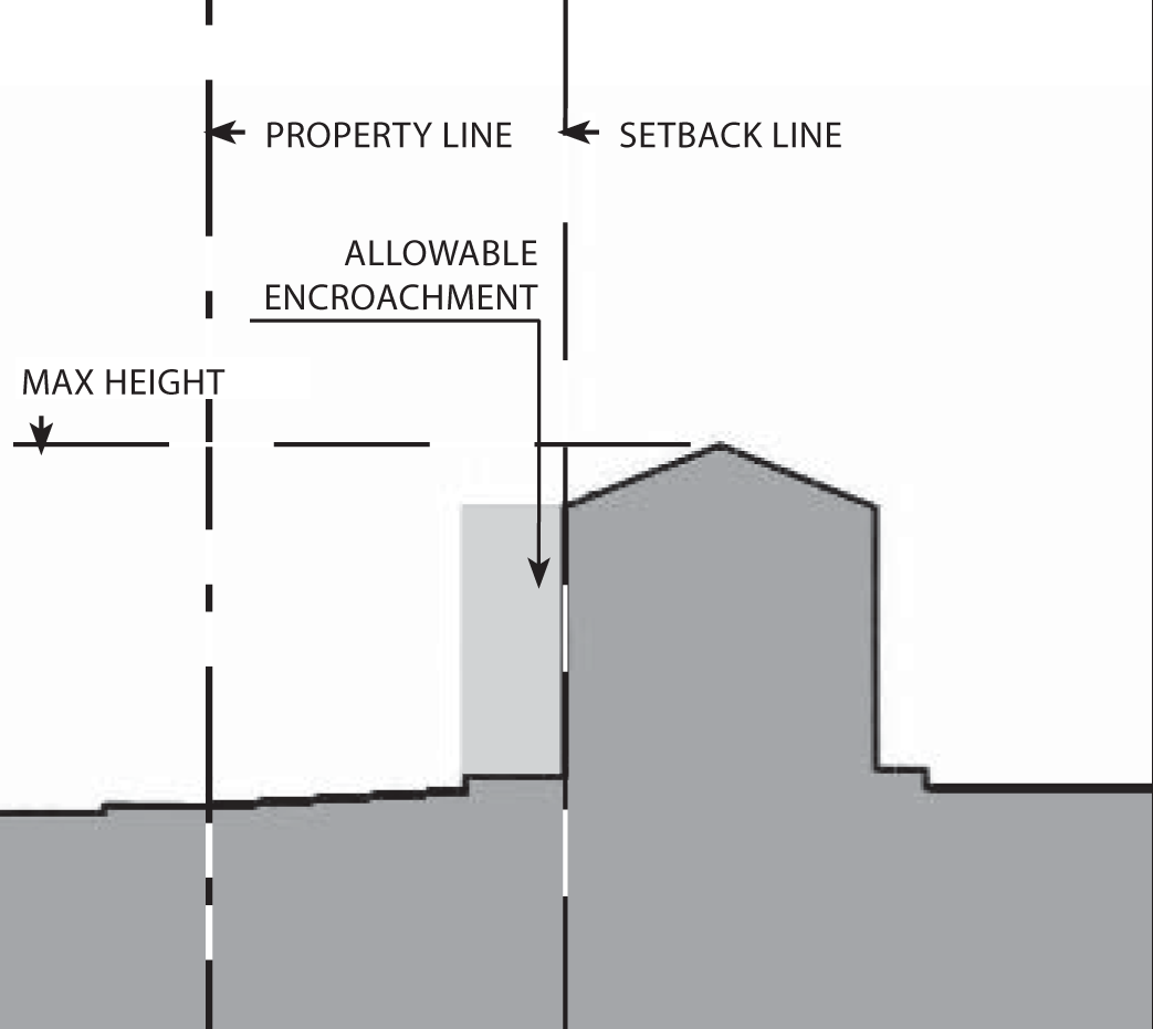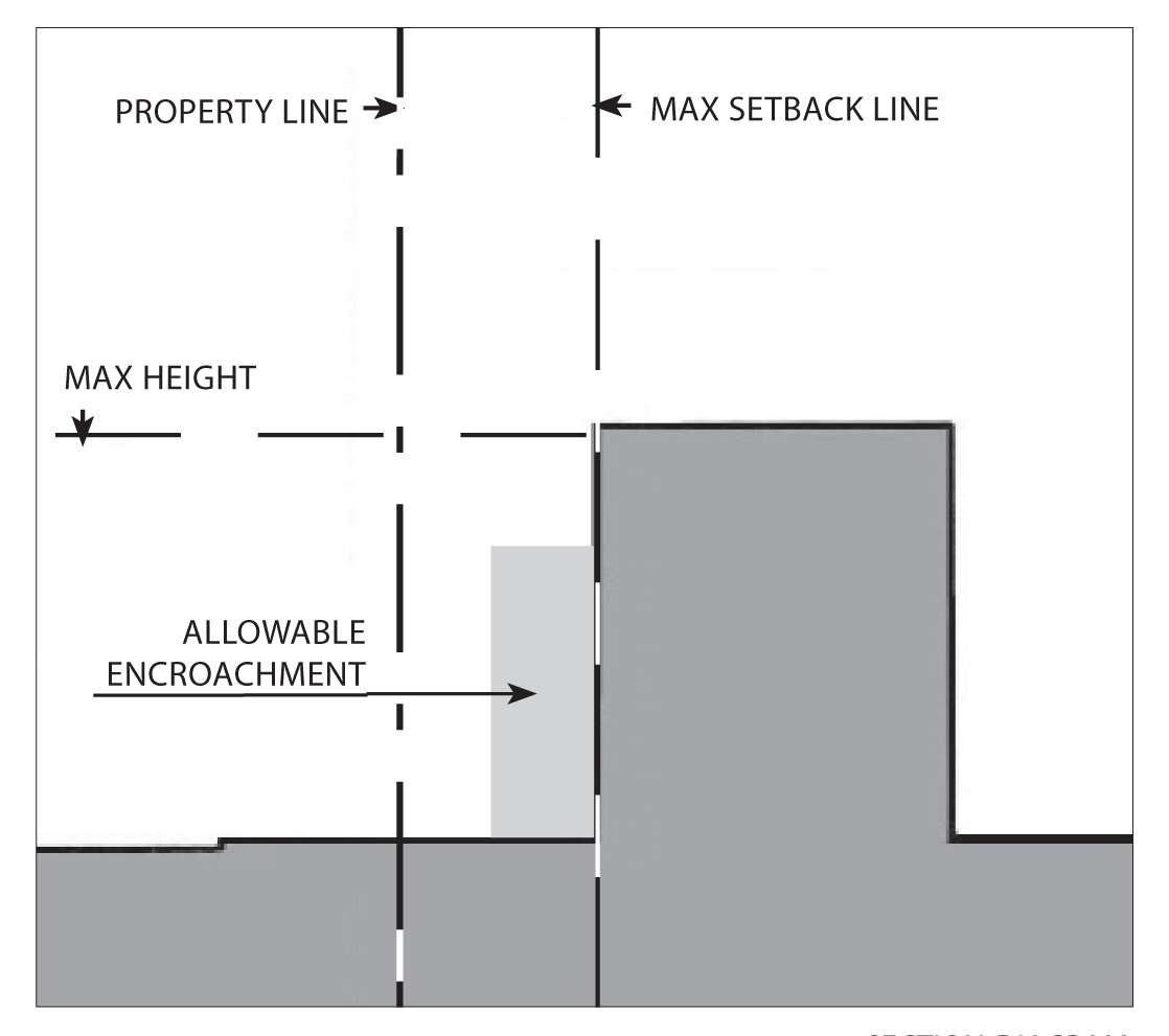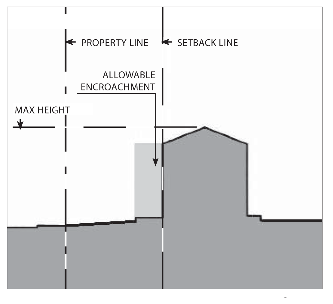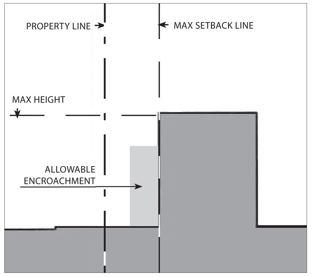 Gallery/arcades, awnings, balconies, porches, and outdoor dining furniture may encroach into the setback and public right-of-way.