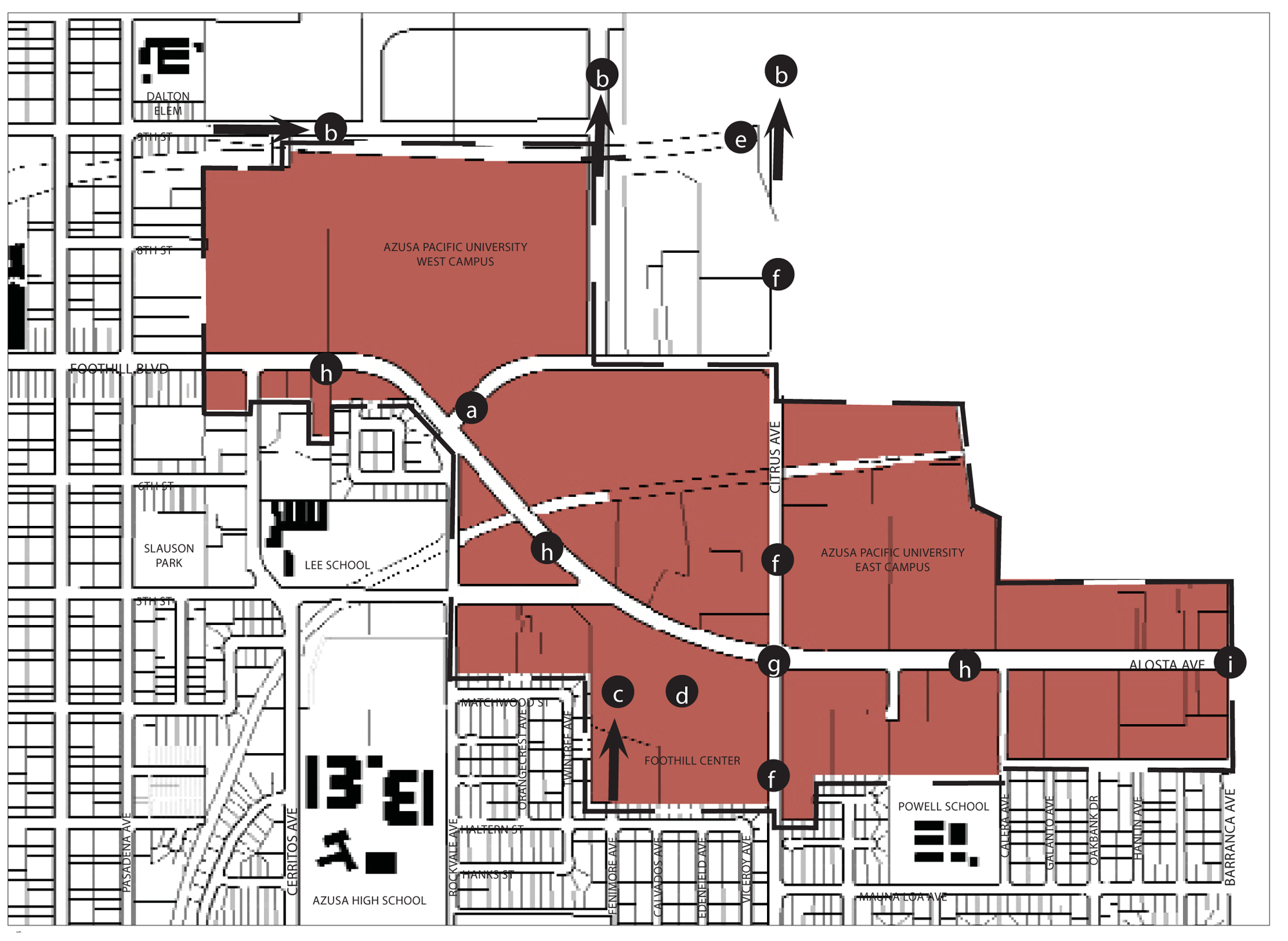 Purpose. The Azusa Pacific University Specific Plan is a comprehensive guide to defining the character of future physical development for the main campus of Azusa Pacific University (APU). The campus is located on two nearby sites (East Campus and West Campus) in Azusa, California. This plan does not address other properties owned or leased by APU in Southern California.