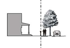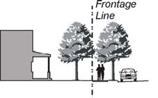 Forecourt. The building facade is aligned close to the front property line with a portion of the facade set back. The resulting forecourt is suitable for gardens, restaurant seating, or an entry plaza. This type should be used sparingly and in conjunction with the types in subsections D. through G. of this Section, as an extensive setback deters pedestrians. Trees within forecourts should be placed to have their canopies overhang the street sidewalk. A short wall may also be placed at the property line. If a forecourt is no more than 20 feet wide, it does not count against the building placement requirements of Article 2 that require a percentage of the building frontage at the back of the sidewalk.