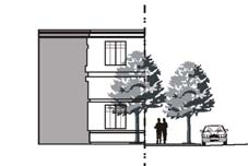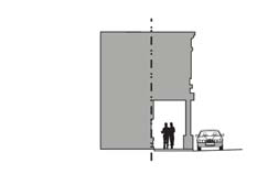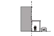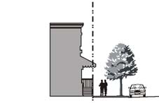 Stoop. The building facade is placed close to the front property line with the ground floor elevated a minimum of 24 inches above the sidewalk. This type is suitable for ground-floor residential use with a minimal front setback.