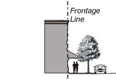 Shopfront. This building façade is intended for retail use and is commonly equipped with an awning, when located adjacent to the property line. An awning that extends over the sidewalk requires an encroachment permit.
