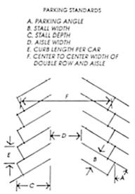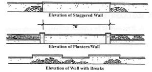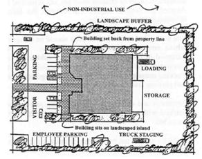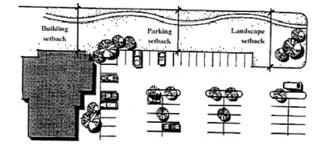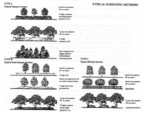 Berms, plantings and low walls to screen parking areas from public rights of way.