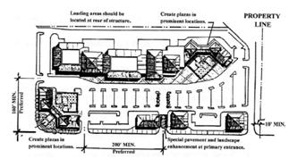 Landscaping should be installed at the base of buildings. Asphalt edges should be avoided.
