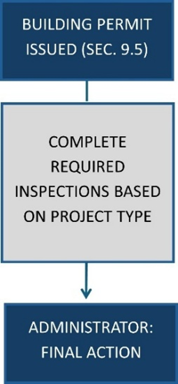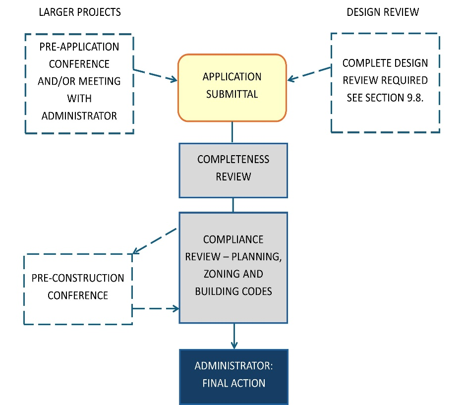 Pre-Application Procedure: For large-scale projects, a pre-construction meeting may be required. For all other projects, no meeting is required, but applicants are encouraged to call or visit the Administrator prior to requesting a Building Permit to determine what information is required for the application.