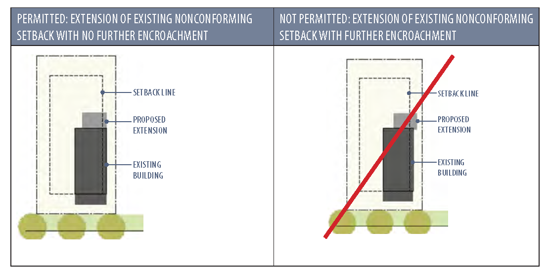 A nonconforming structure shall not be expanded in any way, except in conformity with this Code, except in cases where the primary building on a lot is nonconforming solely as a result of a setback encroachment, additions to the structure can be allowed, provided the new addition does not project into the setback. If a proposed addition would encroach into the same setback that already had been encroached upon, the addition can be allowed, provided it projects no further into the setback than the existing structure.