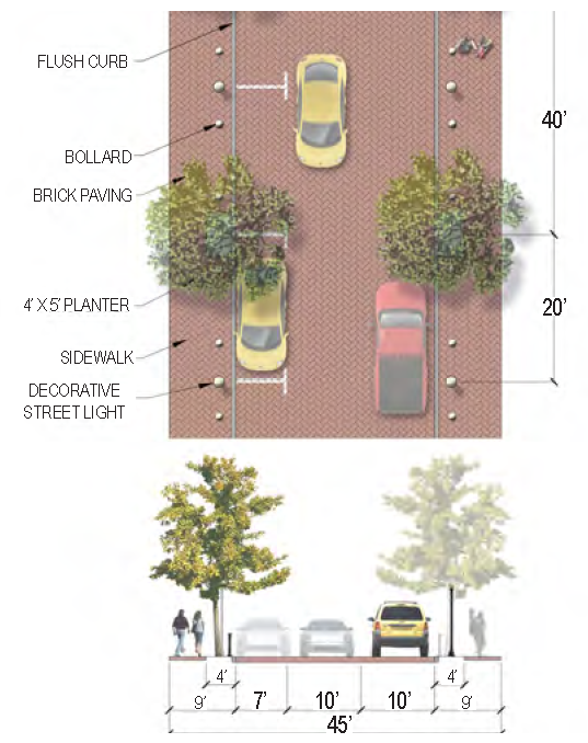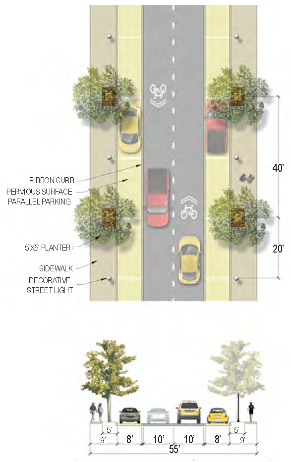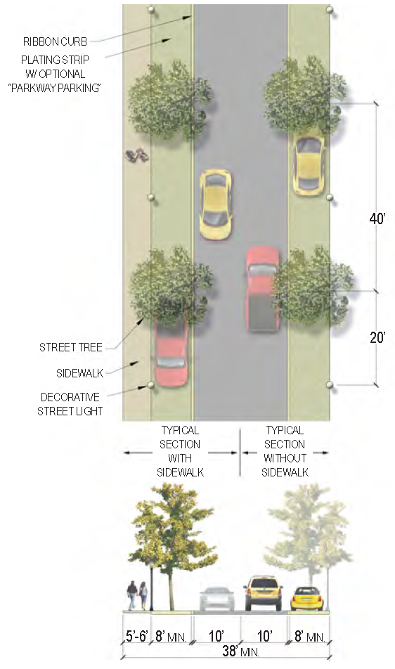 | Sidewalk (Width) | 2 sides (6 feet minimum; 12' preferred) |