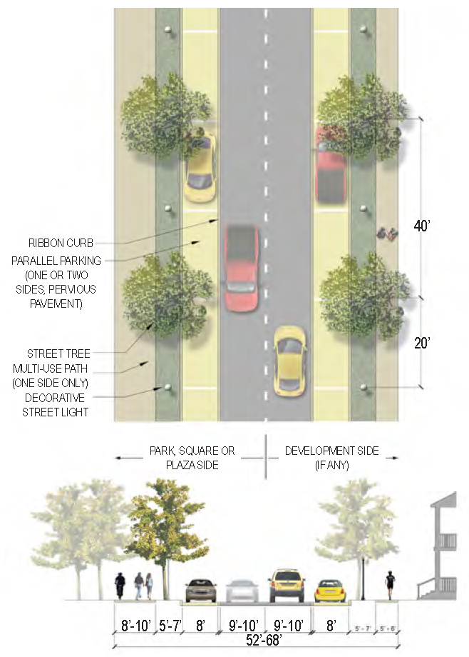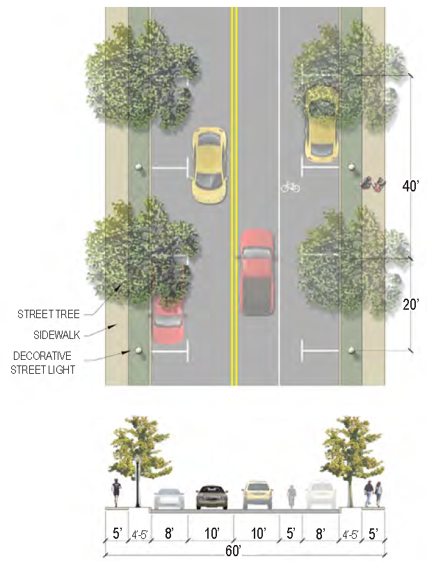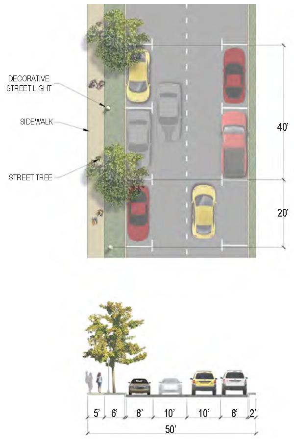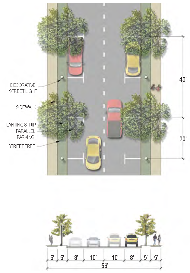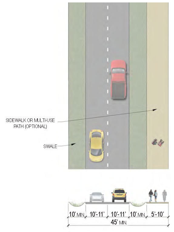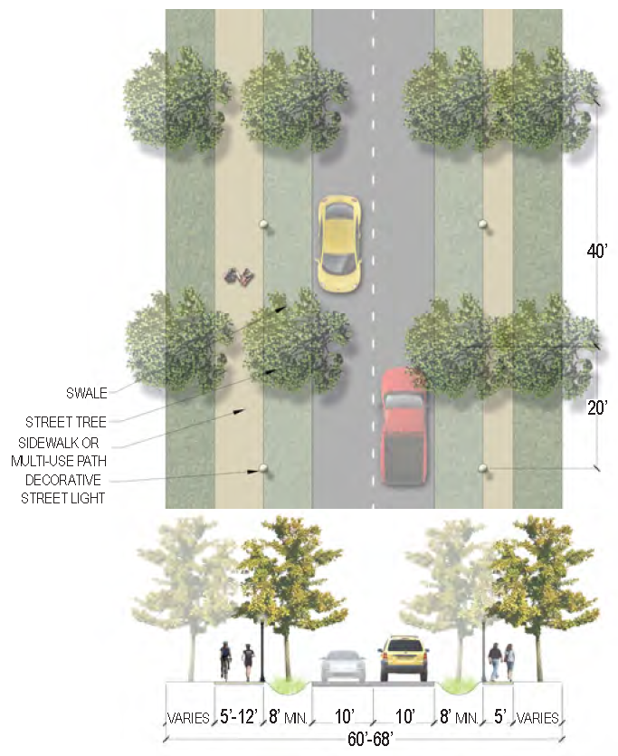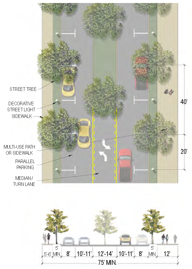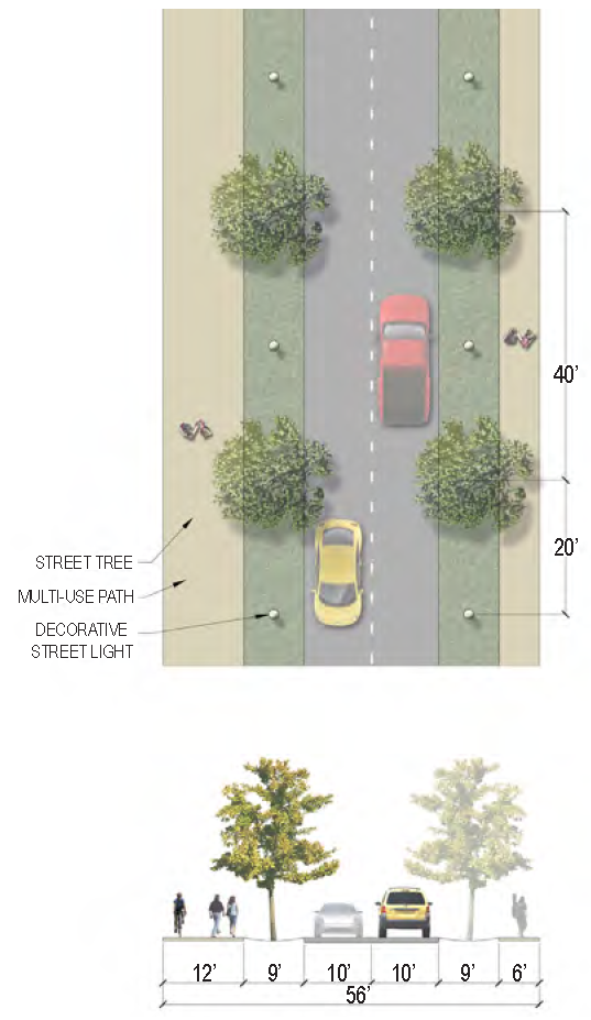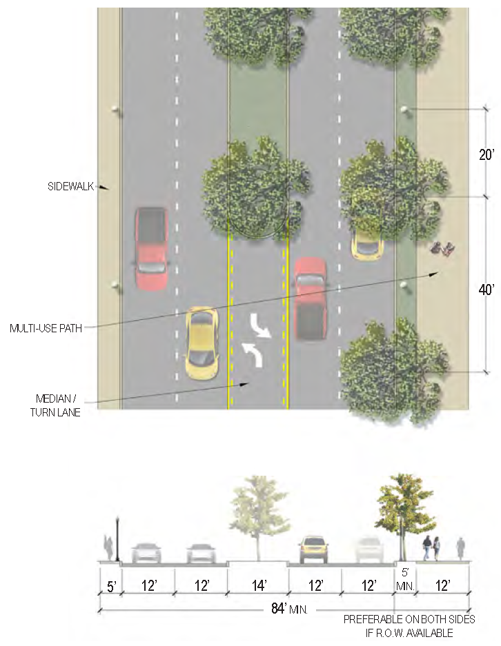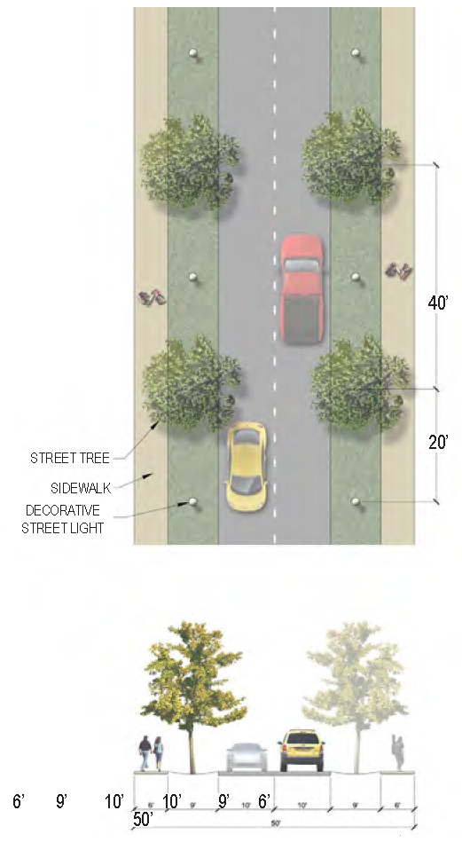 | Sidewalk (Width) | 2 sides (6 feet minimum; 10' minimum for multi-use path) |