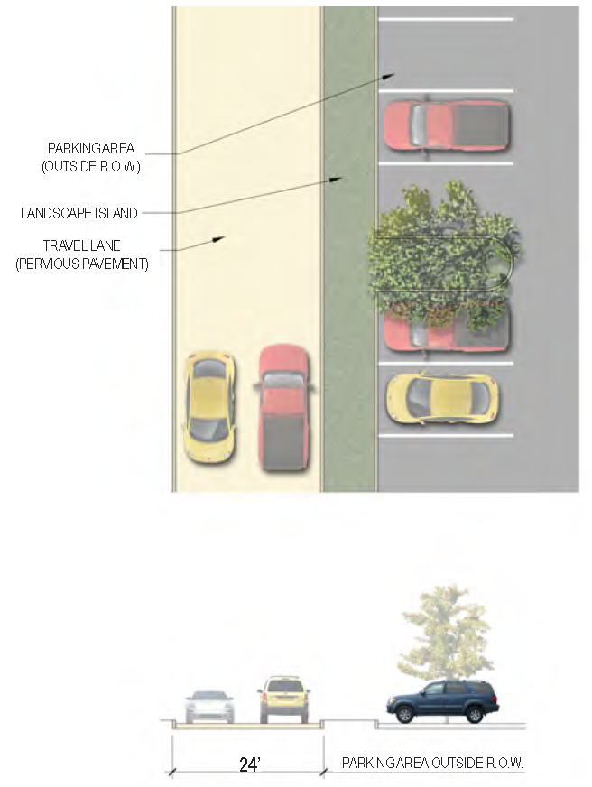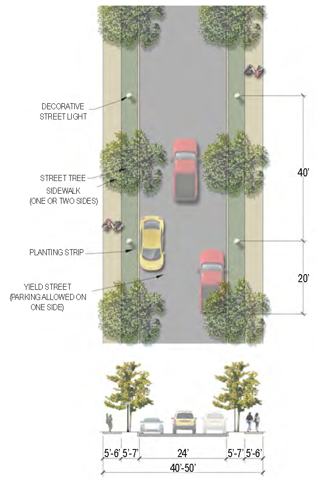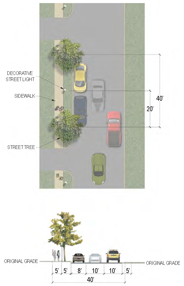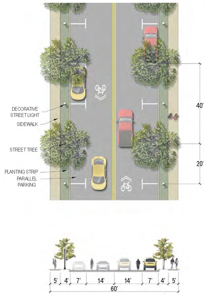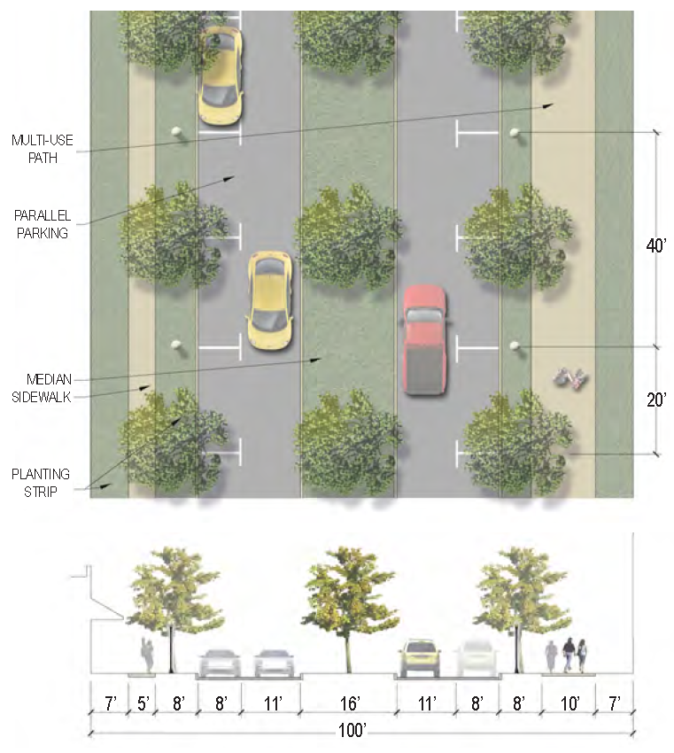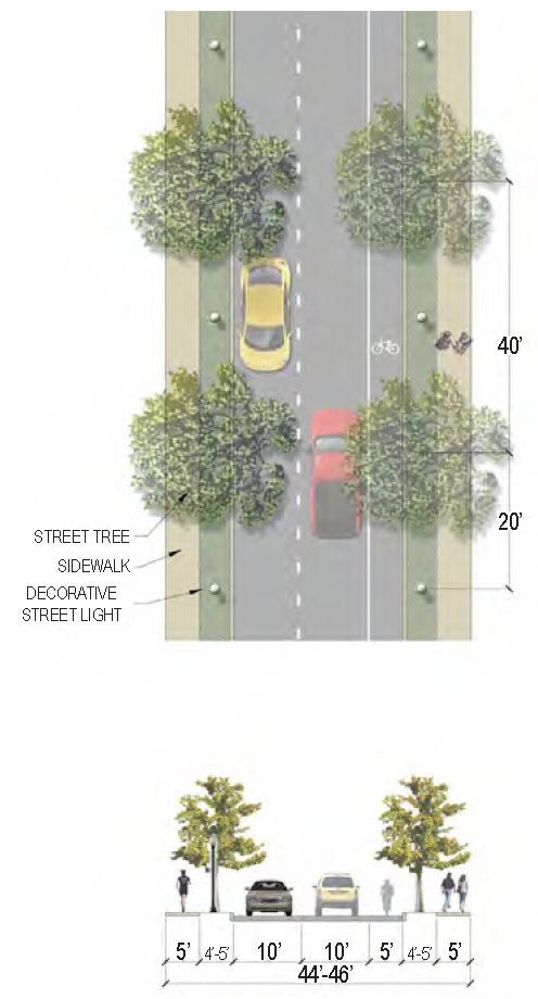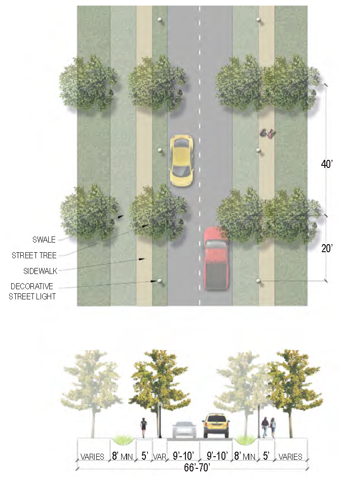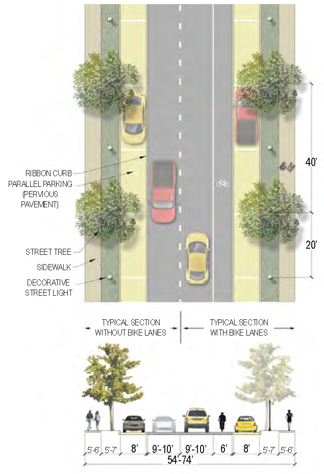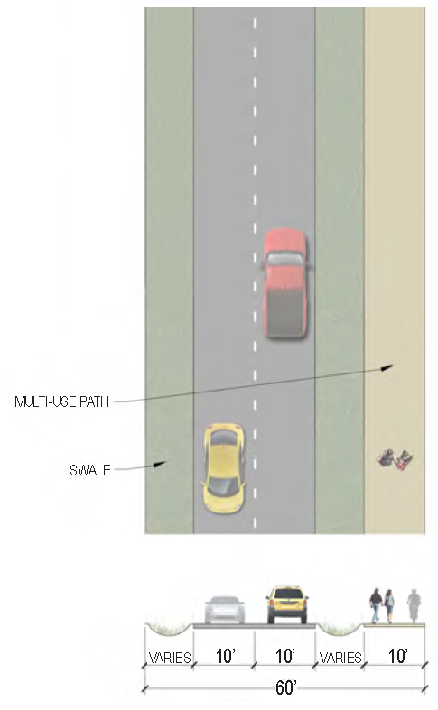 | Sidewalk (Width) | 2 sides (6 feet minimum; 10' minimum for multi-use path) |