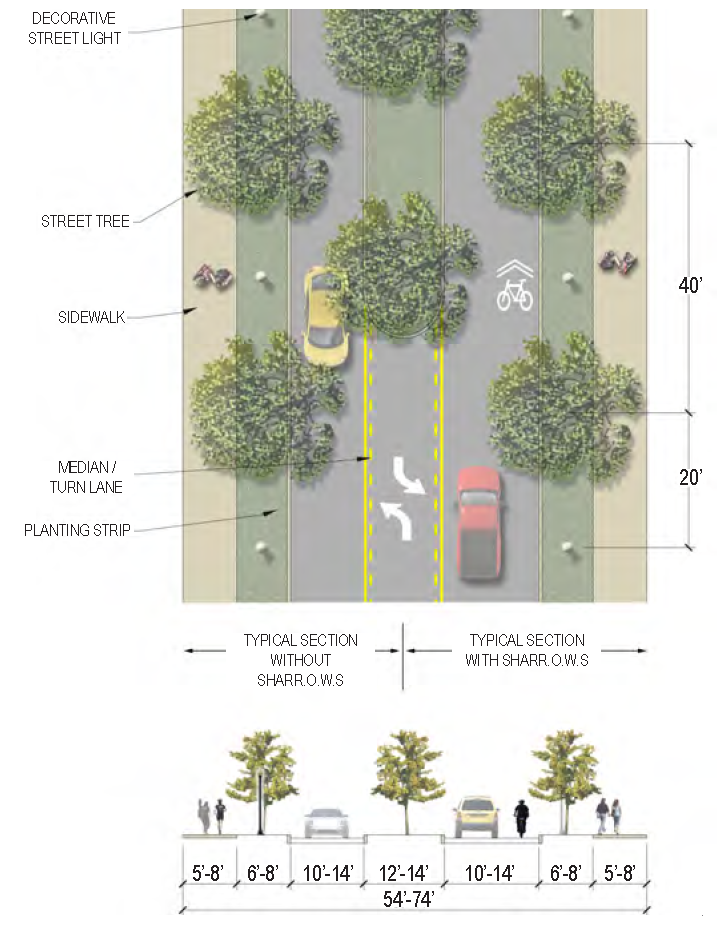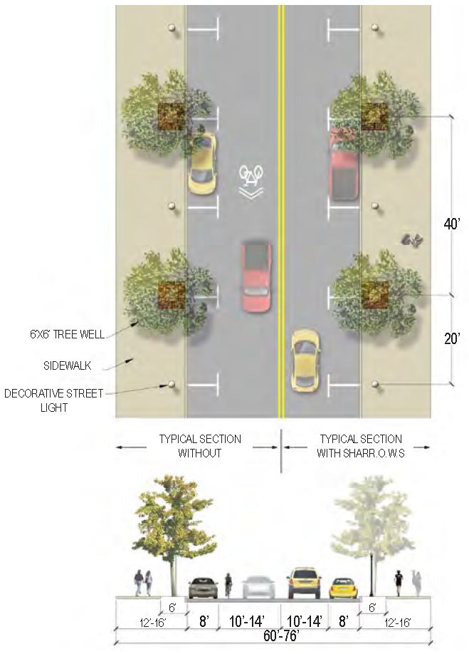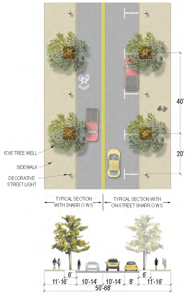 | Bike Facilities | Multi-use path on west side (would require additional R.O.W.) or sharrow |