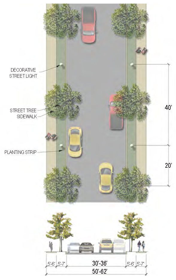 The following pages outline street standards that promote a complete street system by tailoring street design to its intended users and development context. This is done via the following diagrams:
