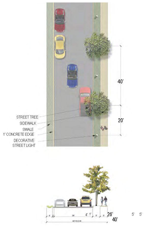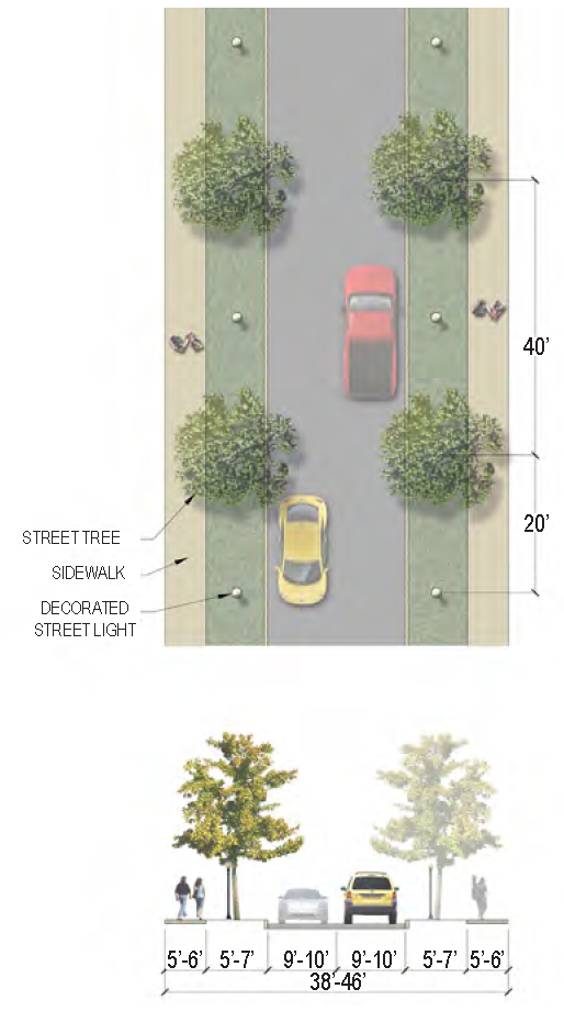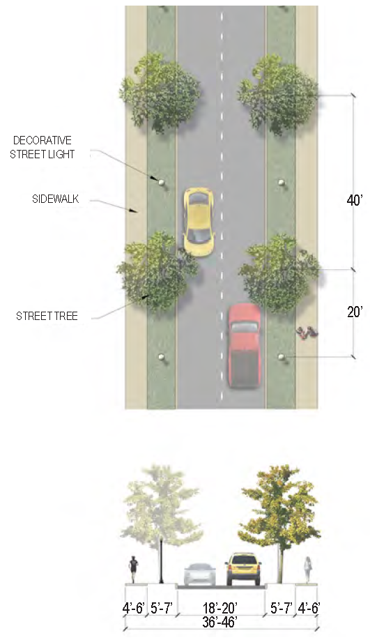 | Street Trees | 40 feet on-center max., overstory; 24 feet on-center max., understory or palms |