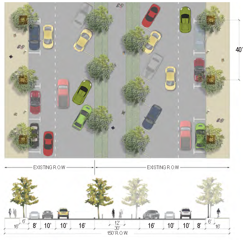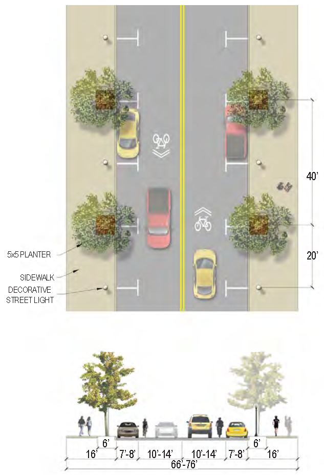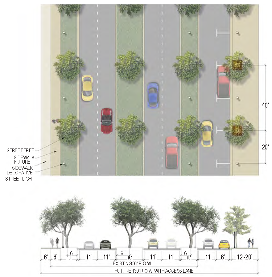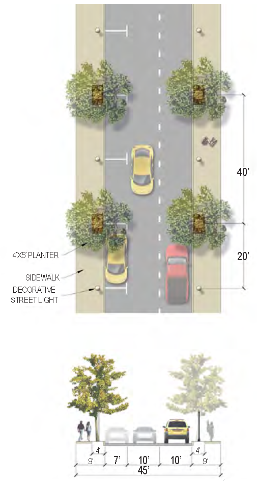 | Planter Type (Width) | Planting strip (6 feet minimum) & Planted median if R.O.W. permits (10-14 feet) |