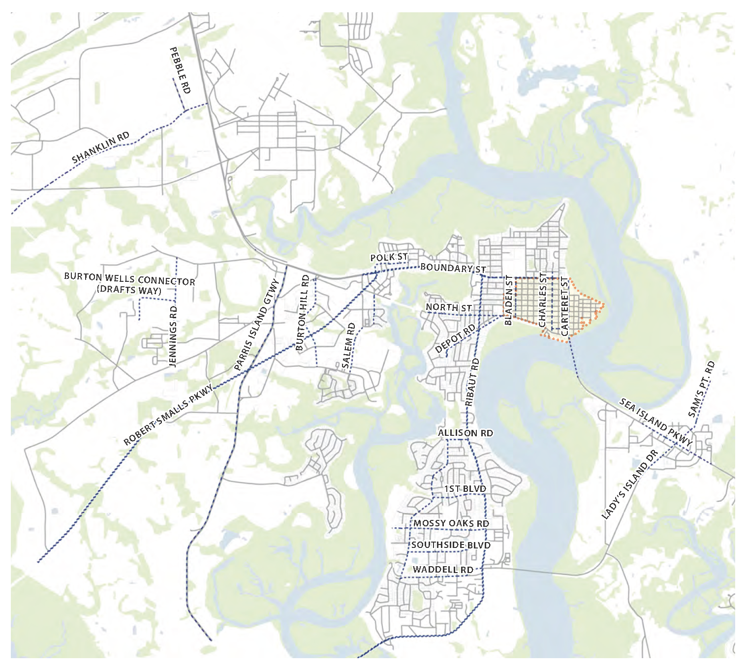 In certain instances, portions of streets have been marked as "Other" on the Street Regulating Plan diagrams. These street segments have been specifically designed with details that deviate from the typical street sections to respond to the context: specific environmental, neighborhood, or development opportunities. Each of these specific street sections are included in this chapter following the typical street sections that apply to most streets throughout Beaufort.
