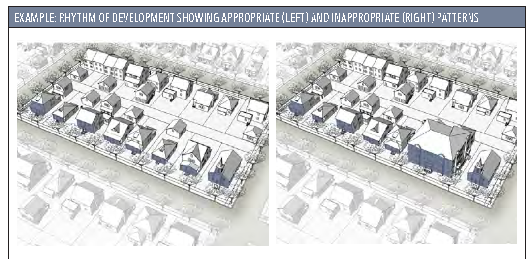 Lot size, massing, siting, floor area ratio, and height must correspond to the adjacent buildings that contribute to or complement the rhythm of the district.