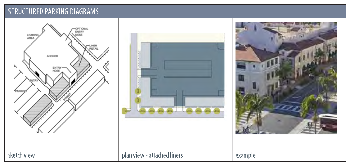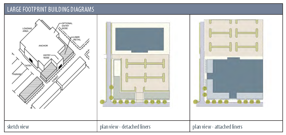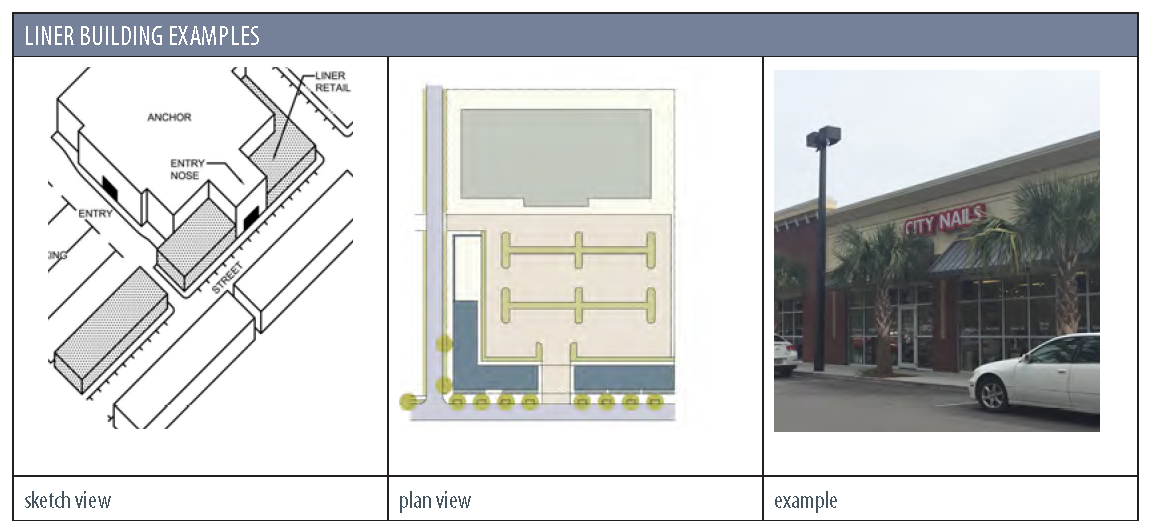 Description: This is a shallow structure, typically 25—30 feet deep, which is placed close to the street frontage. It is typically used in conjunction with other Liner Buildings to conceal surface or structured parking, or large-scale commercial buildings. These buildings may contain a variety of uses, including ground floor commercial, and upper-level offices or residential.