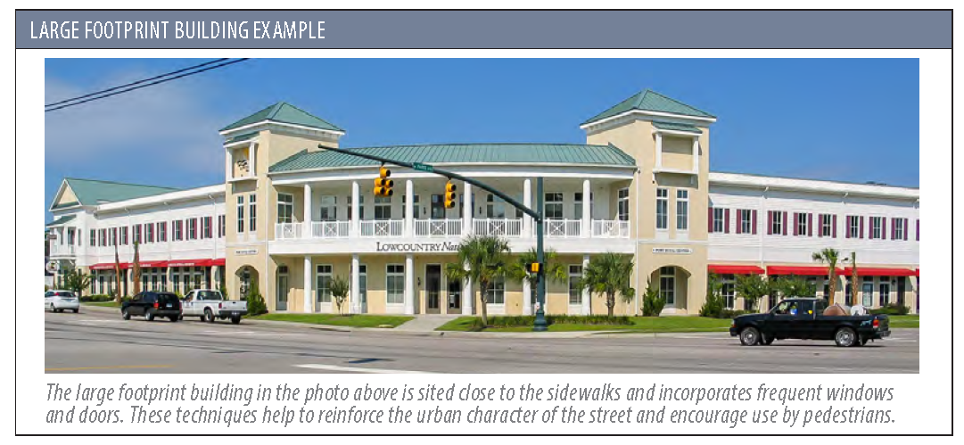Building footprints shall not be larger than a single block. Where there is not a defined block structure in the area, see Section 7.2.2 B. for additional standards.