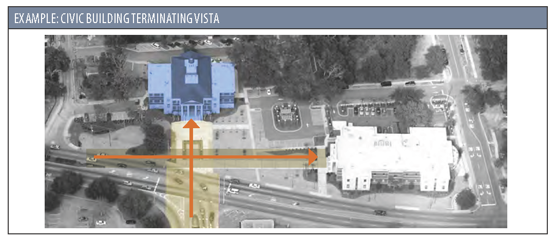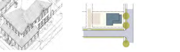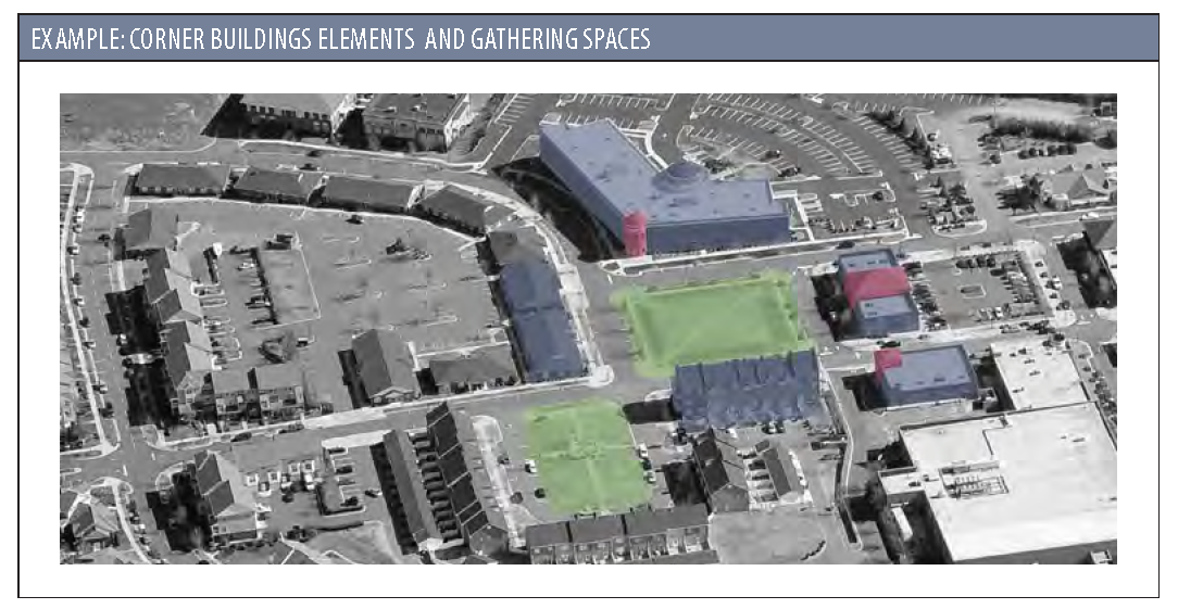 On corner lots, distinct roof or building elements shall be utilized, such as porches, canopies, Arcades, or towers. Buildings may be aligned to create public gathering spaces, while conforming to the building placement and orientation requirements set out in Section 2.5.1 C.