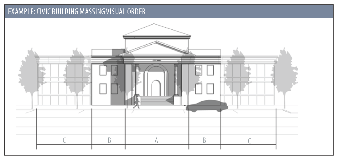 Shall be divided into architecturally distinct sections (or bays) with similar proportions. The bays should average no greater than 35 linear feet wide through the use of different architectural divisions or elements such as pilasters, columns, and/or changes in wall depths or floor and roof levels.