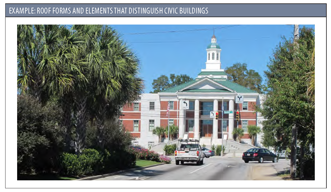 Permitted roof types include gabled, hipped, shed, barrel vaulted, flat, mono-pitch, and domed. Applied and partial (less than 3 sides) mansard roofs are not typically permitted but may be permitted at the discretion of the Design Review Body based on compatibility with the surrounding context, size, mass and scale of the structure.