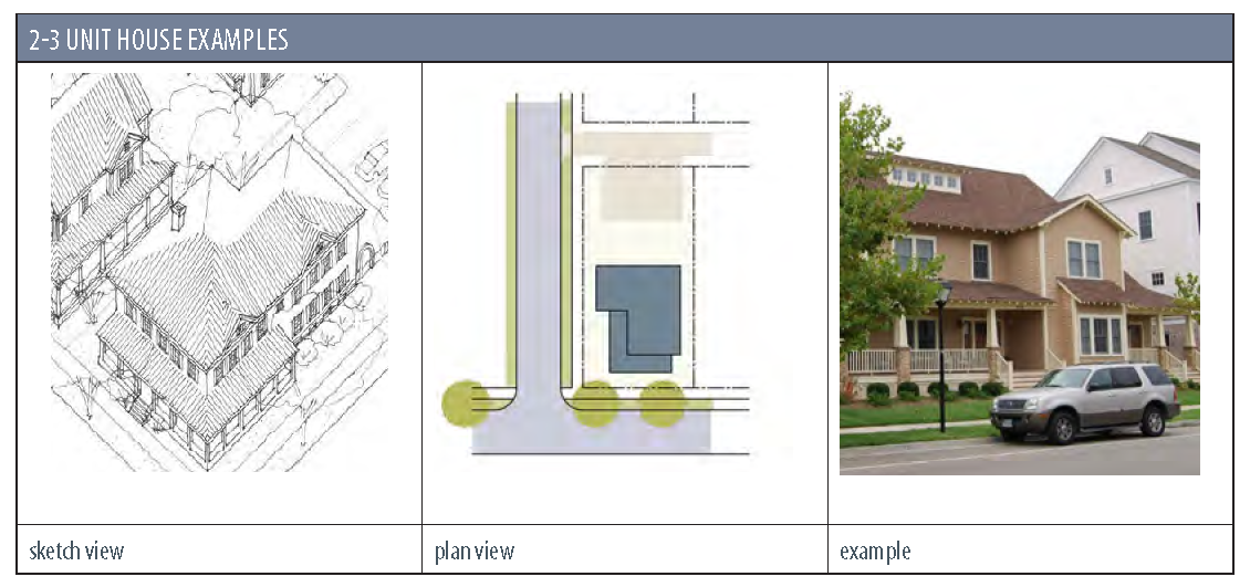 Description: This house-form seamlessly fits into a predominantly single-family neighborhood, but contains multiple dwelling units. The units may be side-by-side, or stacked. They typically have separate entrances off of the street, but may share a common entrance. They are located under one roof and do not have parapets dividing the units.