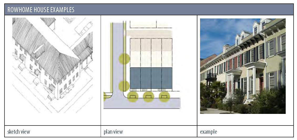 Description: This is an attached residential building type that is part of a series of other rowhomes with more than three units in a row. Three or fewer is considered a 2—3 unit building. Rowhomes may have parapet walls dividing the units, or be combined under one roof form. They are elevated above the street a minimum of 3 feet for privacy, and are typically accessed by stoops. They may also utilize the forecourt and porch frontage types.