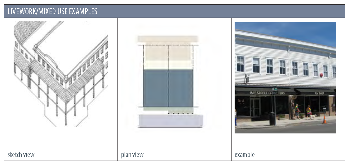Description: This is a building that buildings contains commercial space, typically at grade, with office or residential living, typically located on the upper level(s). They are typically attached, but may be freestanding structures. The ground floor has a substantial amount of glazing, and often utilizes the shopfront frontage type.